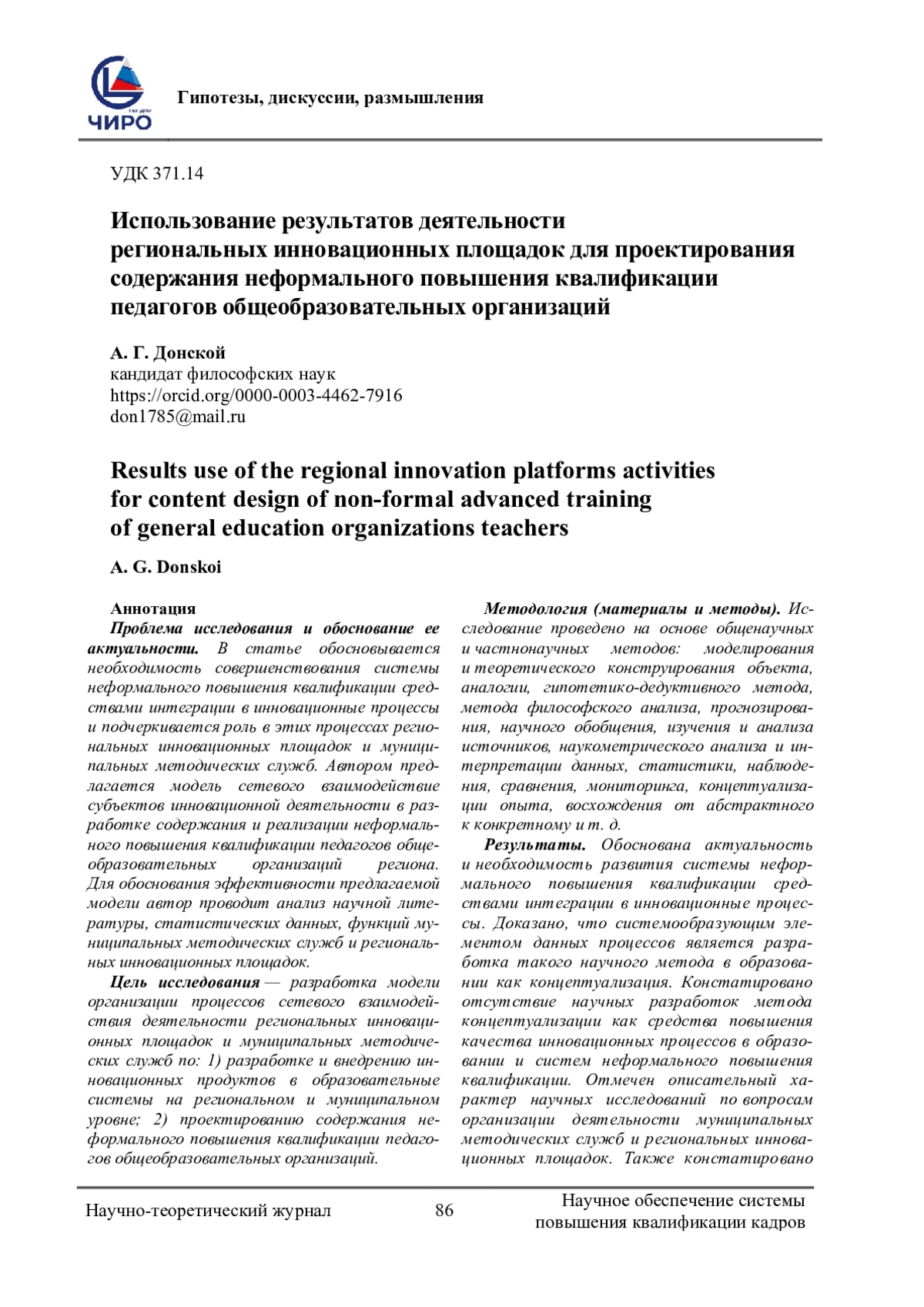 Проблема исследования и обоснование ее актуальности. В статье обосновывается необходимость совершенствования системы неформального повышения квалификации средствами интеграции в инновационные процессы и подчеркивается роль в этих процессах региональных инновационных площадок и муниципальных методических служб. Автором предлагается модель сетевого взаимодействие субъектов инновационной деятельности в разработке содержания и реализации неформального повышения квалификации педагогов общеобразовательных организаций региона. Для обоснования эффективности предлагаемой модели автор проводит анализ научной литературы, статистических данных, функций муниципальных методических служб и региональных инновационных площадок. Цель исследования - разработка модели организации процессов сетевого взаимодействия деятельности региональных инновационных площадок и муниципальных методических служб по: 1) разработке и внедрению инновационных продуктов в образовательные системы на региональном и муниципальном уровне; 2) проектированию содержания неформального повышения квалификации педагогов общеобразовательных организаций. Методология (материалы и методы). Исследование проведено на основе общенаучных и частнонаучных методов: моделирования и теоретического конструирования объекта, аналогии, гипотетико-дедуктивного метода, метода философского анализа, прогнозирования, научного обобщения, изучения и анализа источников, наукометрического анализа и интерпретации данных, статистики, наблюдения, сравнения, мониторинга, концептуализации опыта, восхождения от абстрактного к конкретному и т. д. Результаты. Обоснована актуальность и необходимость развития системы неформального повышения квалификации средствами интеграции в инновационные процессы. Доказано, что системообразующим элементом данных процессов является разработка такого научного метода в образовании как концептуализация. Констатировано отсутствие научных разработок метода концептуализации как средства повышения качества инновационных процессов в образовании и систем неформального повышения квалификации. Отмечен описательный характер научных исследований по вопросам организации деятельности муниципальных методических служб и региональных инновационных площадок. Также констатировано практически полное отсутствие презентации в научных исследованиях механизмов консолидации ресурсов данных организаций по разработке и внедрению инновационных продуктов в образовательные системы на региональном и муниципальном уровне, проектированию содержания неформального повышения квалификации педагогов общеобразовательных организаций. Была разработана и представлена в виде модели структура сетевого взаимодействия муниципальных методических служб и региональных инновационных площадок. Установлено, что данная структура демонстрирует реальные способы сетевого взаимодействия через раскрытие общих для субъектов инновационной деятельности целей, задающих распределение функций и точки консолидации ресурсов; позволяет вывести опыт сетевого взаимодействия муниципальных методических служб и региональных инновационных площадок за рамки муниципалитета и создавать кустовые сети по тематическому признаку на уровне региональной системы об