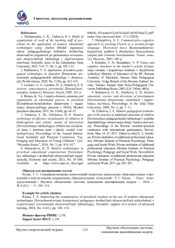 РУСАН Т.С. СОВЕРШЕНСТВОВАНИЕ КОМПЕТЕНЦИЙ ПЕДАГОГОВ ДОШКОЛЬНЫХ ОБРАЗОВАТЕЛЬНЫХ УЧРЕЖДЕНИЙ В ИСПОЛЬЗОВАНИИ СОВРЕМЕННЫХ ОБРАЗОВАТЕЛЬНЫХ ТЕХНОЛОГИЙ // НАУЧНОЕ ОБЕСПЕЧЕНИЕ СИСТЕМЫ ПОВЫШЕНИЯ КВАЛИФИКАЦИИ КАДРОВ. 2024. № 4 (61)