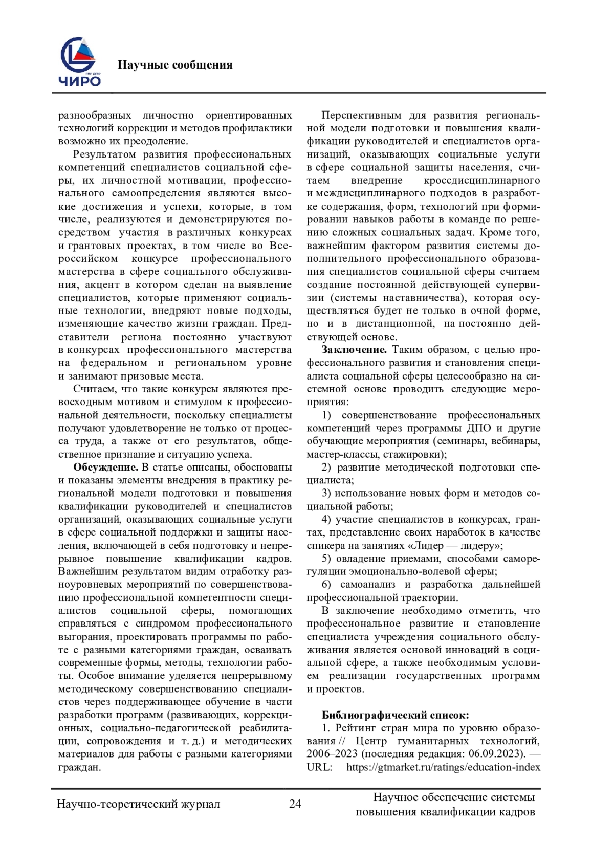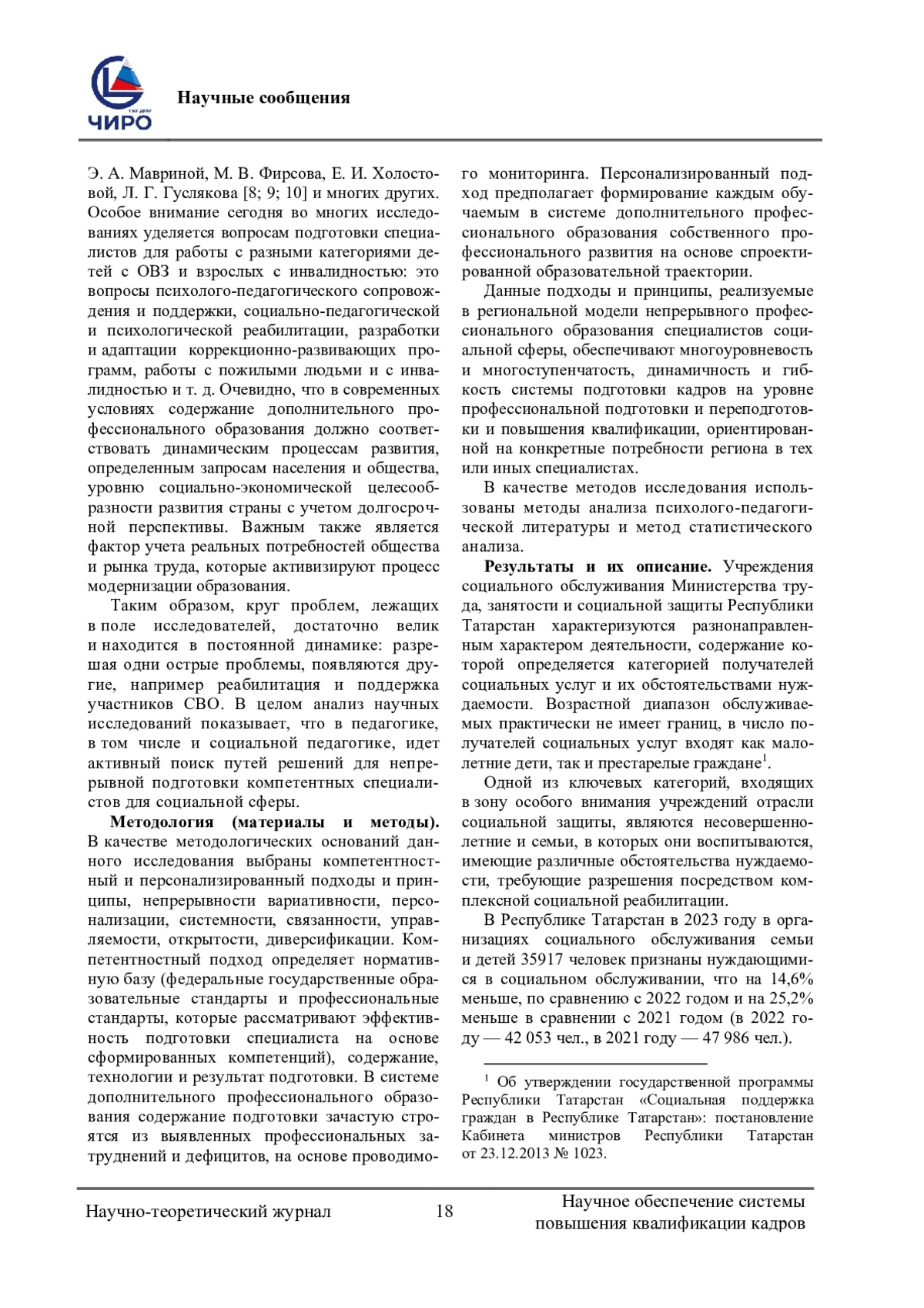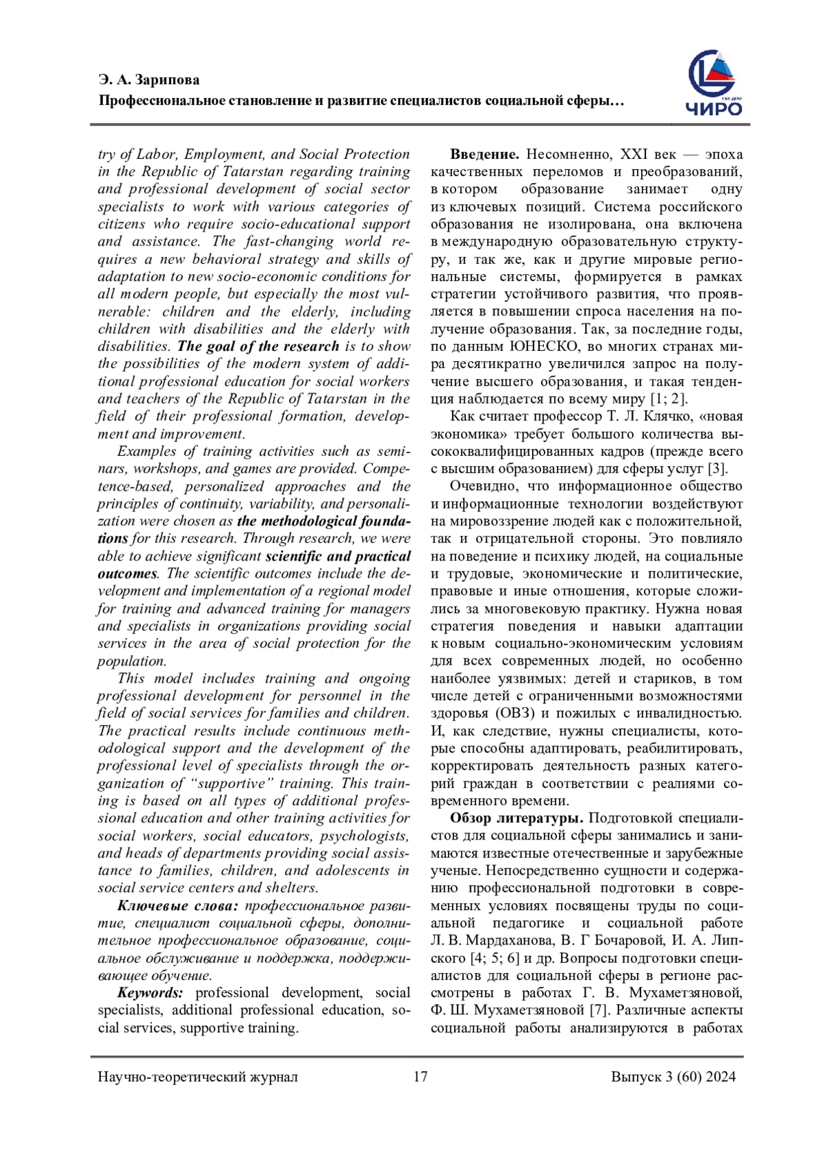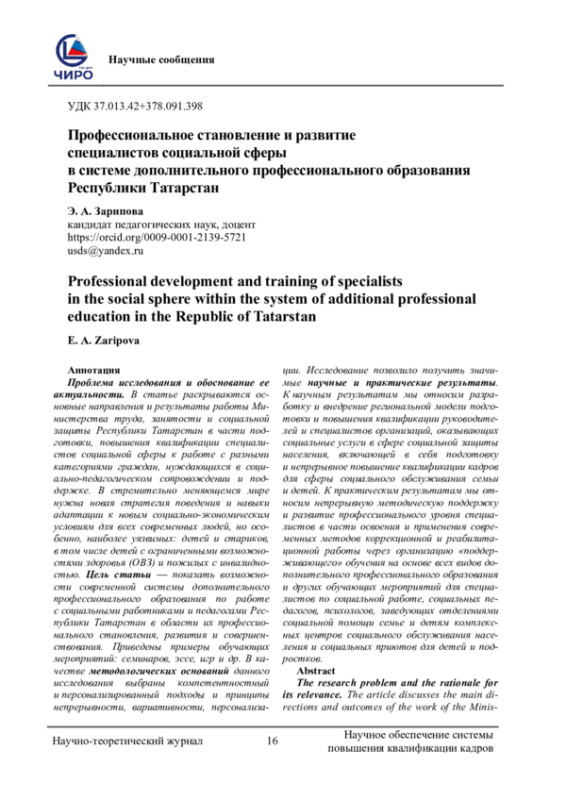 Проблема исследования и обоснование ее актуальности. В статье раскрываются основные направления и результаты работы Министерства труда, занятости и социальной защиты Республики Татарстан в части подготовки, повышения квалификации специалистов социальной сферы к работе с разными категориями граждан, нуждающихся в социально-педагогическом сопровождении и поддержке. В стремительно меняющемся мире нужна новая стратегия поведения и навыки адаптации к новым социально-экономическим условиям для всех современных людей, но особенно, наиболее уязвимых: детей и стариков, в том числе детей с ограниченными возможностями здоровья (ОВЗ) и пожилых с инвалидностью. Цель статьи - показать возможности современной системы дополнительного профессионального образования по работе с социальными работниками и педагогами Республики Татарстан в области их профессионального становления, развития и совершенствования. Приведены примеры обучающих мероприятий: семинаров, эссе, игр и др. В качестве методологических оснований данного исследования выбраны компетентностный и персонализированный подходы и принципы непрерывности, вариативности, персонализации. Исследование позволило получить значимые научные и практические результаты. К научным результатам мы относим разработку и внедрение региональной модели подготовки и повышения квалификации руководителей и специалистов организаций, оказывающих социальные услуги в сфере социальной защиты населения, включающей в себя подготовку и непрерывное повышение квалификации кадров для сферы социального обслуживания семьи и детей. К практическим результатам мы относим непрерывную методическую поддержку и развитие профессионального уровня специалистов в части освоения и применения современных методов коррекционной и реабилитационной работы через организацию «поддерживающего» обучения на основе всех видов дополнительного профессионального образования и других обучающих мероприятий для специалистов по социальной работе, социальных педагогов, психологов, заведующих отделениями социальной помощи семье и детям комплексных центров социального обслуживания населения и социальных приютов для детей и подростков.