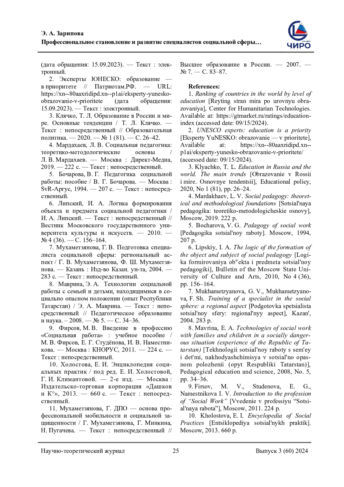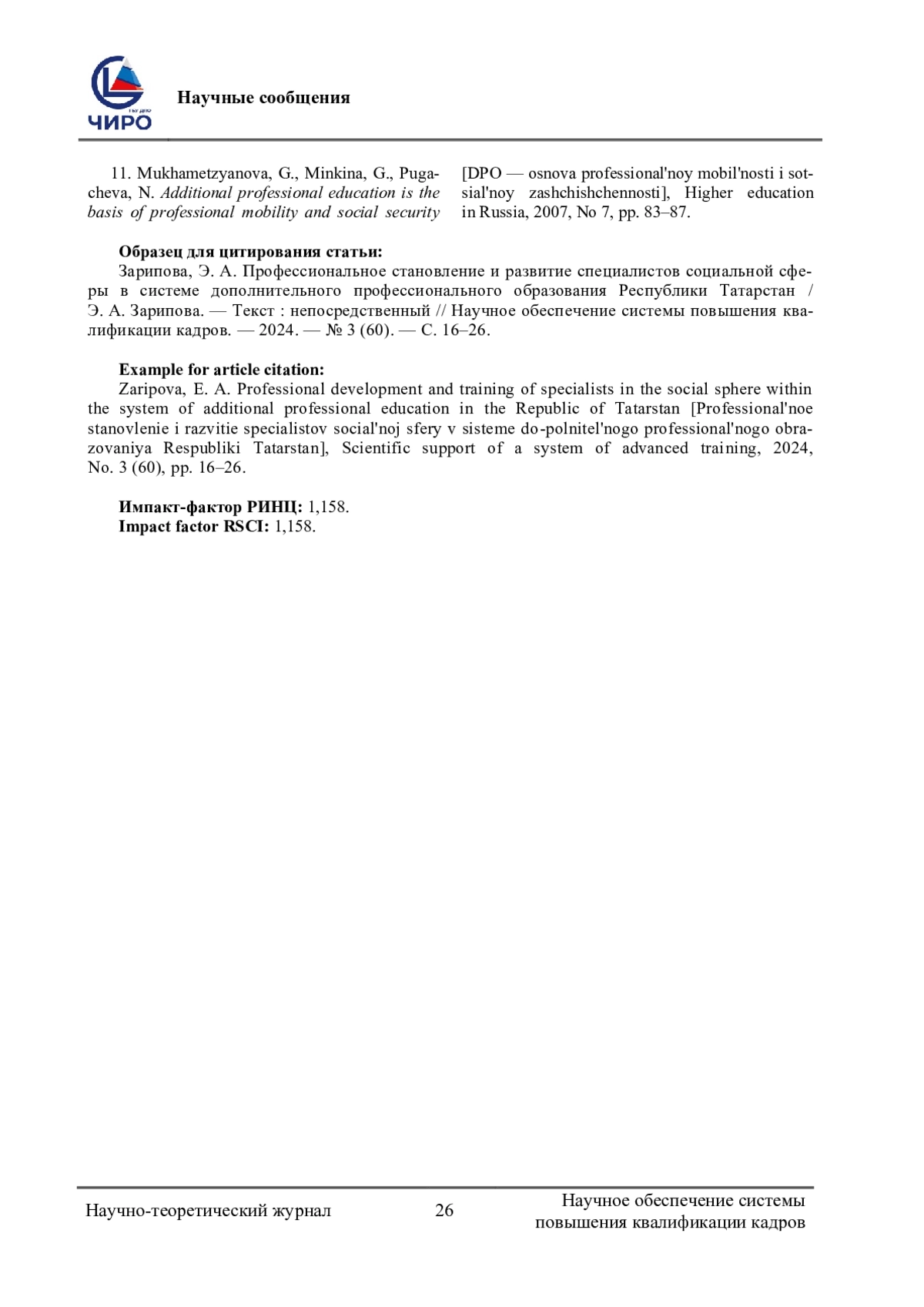 11. Мухаметзянова, Г. ДПО - основа профессиональной мобильности и социальной защищенности / Г. Мухаметзянова, Г. Минкина, Н. Пугачева. - Текст: непосредственный // Высшее образование в России. - 2007. - № 7. - С. 83-87. EDN: IBQEWD