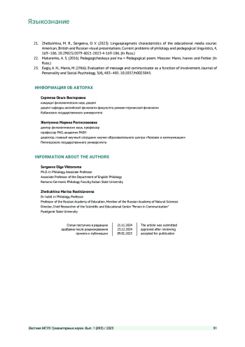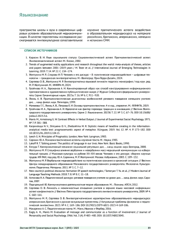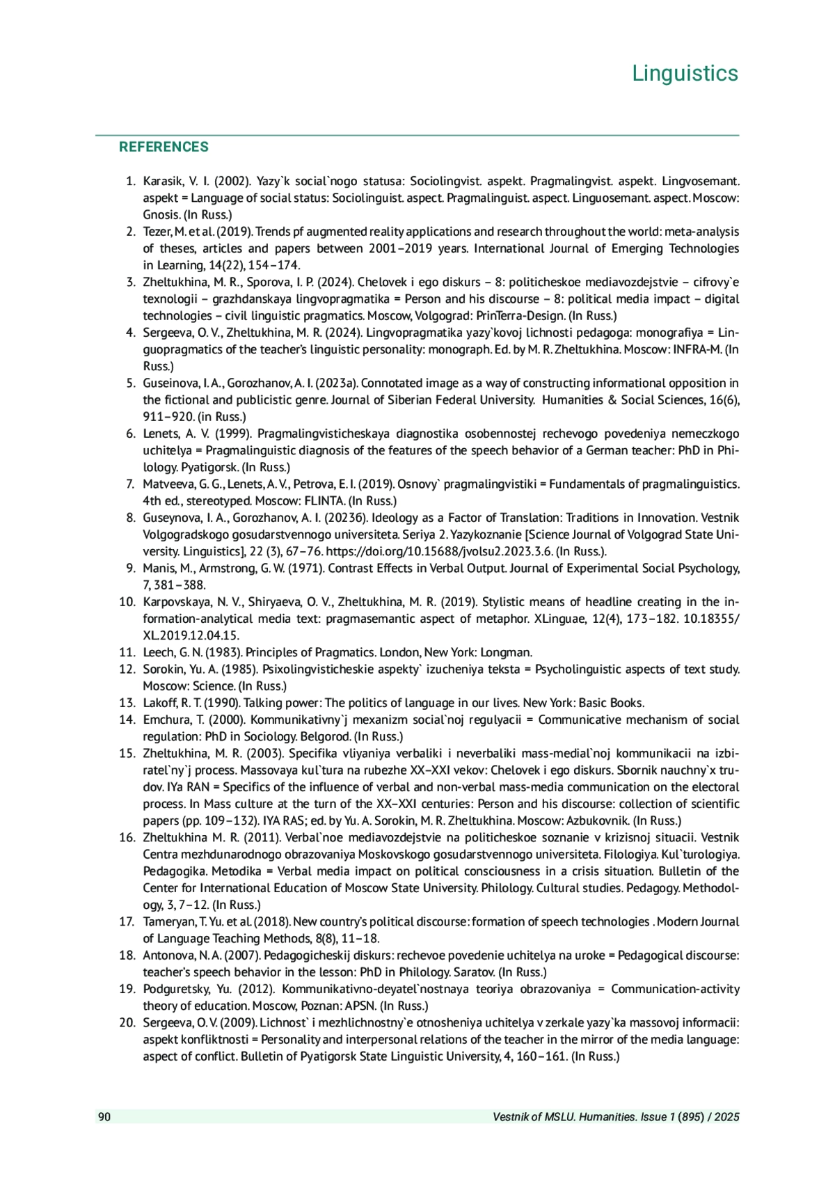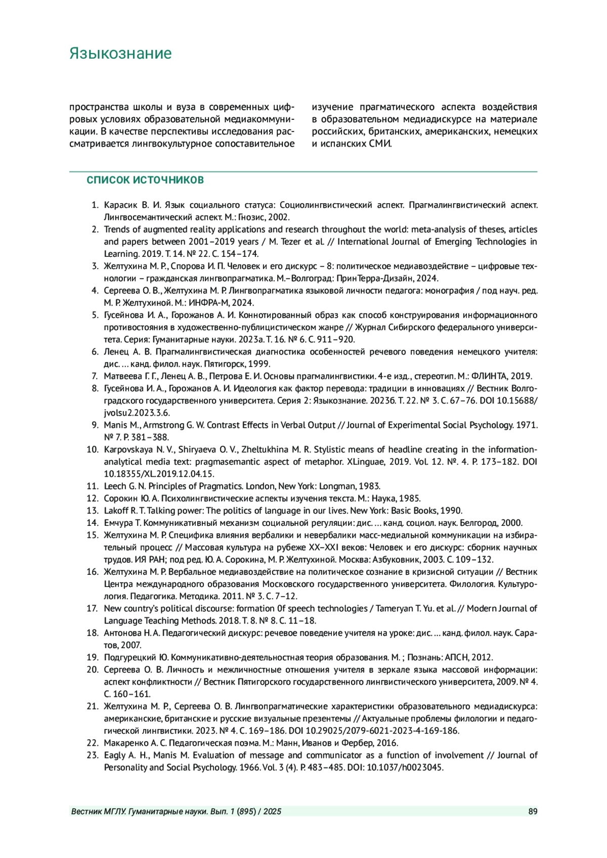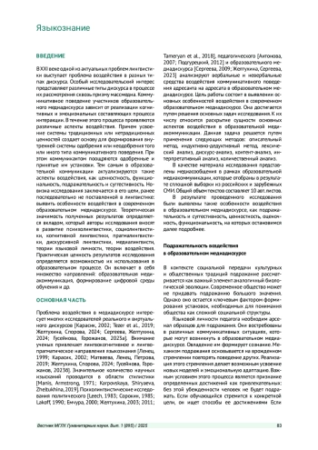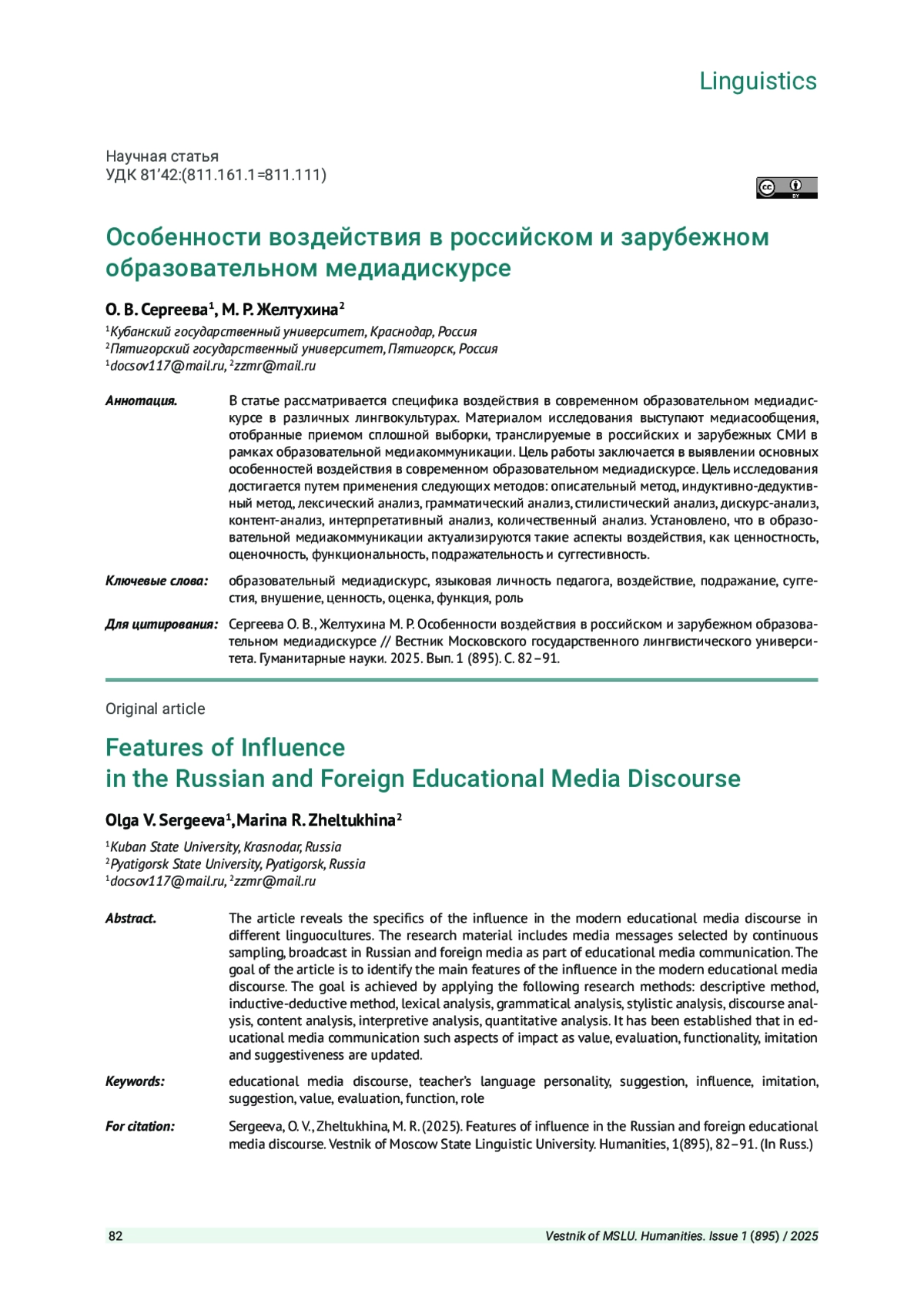 СЕРГЕЕВА О. В., ЖЕЛТУХИНА М. Р. ОСОБЕННОСТИ ВОЗДЕЙСТВИЯ В РОССИЙСКОМ И ЗАРУБЕЖНОМ ОБРАЗОВАТЕЛЬНОМ МЕДИАДИСКУРСЕ // ВЕСТНИК МОСКОВСКОГО ГОСУДАРСТВЕННОГО ЛИНГВИСТИЧЕСКОГО УНИВЕРСИТЕТА. ГУМАНИТАРНЫЕ НАУКИ. 2025. № 1 (895)
