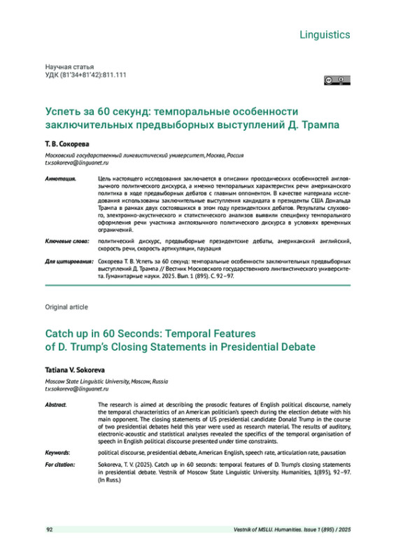 Цель настоящего исследования заключается в описании просодических особенностей англоязычного политического дискурса, а именно темпоральных характеристик речи американского политика в ходе предвыборных дебатов с главным оппонентом. В качестве материала исследования использованы заключительные выступления кандидата в президенты США Дональда Трампа в рамках двух состоявшихся в этом году президентских дебатов. Результаты слухового, электронно-акустического и статистического анализов выявили специфику темпорального оформления речи участника англоязычного политического дискурса в условиях временных ограничений.