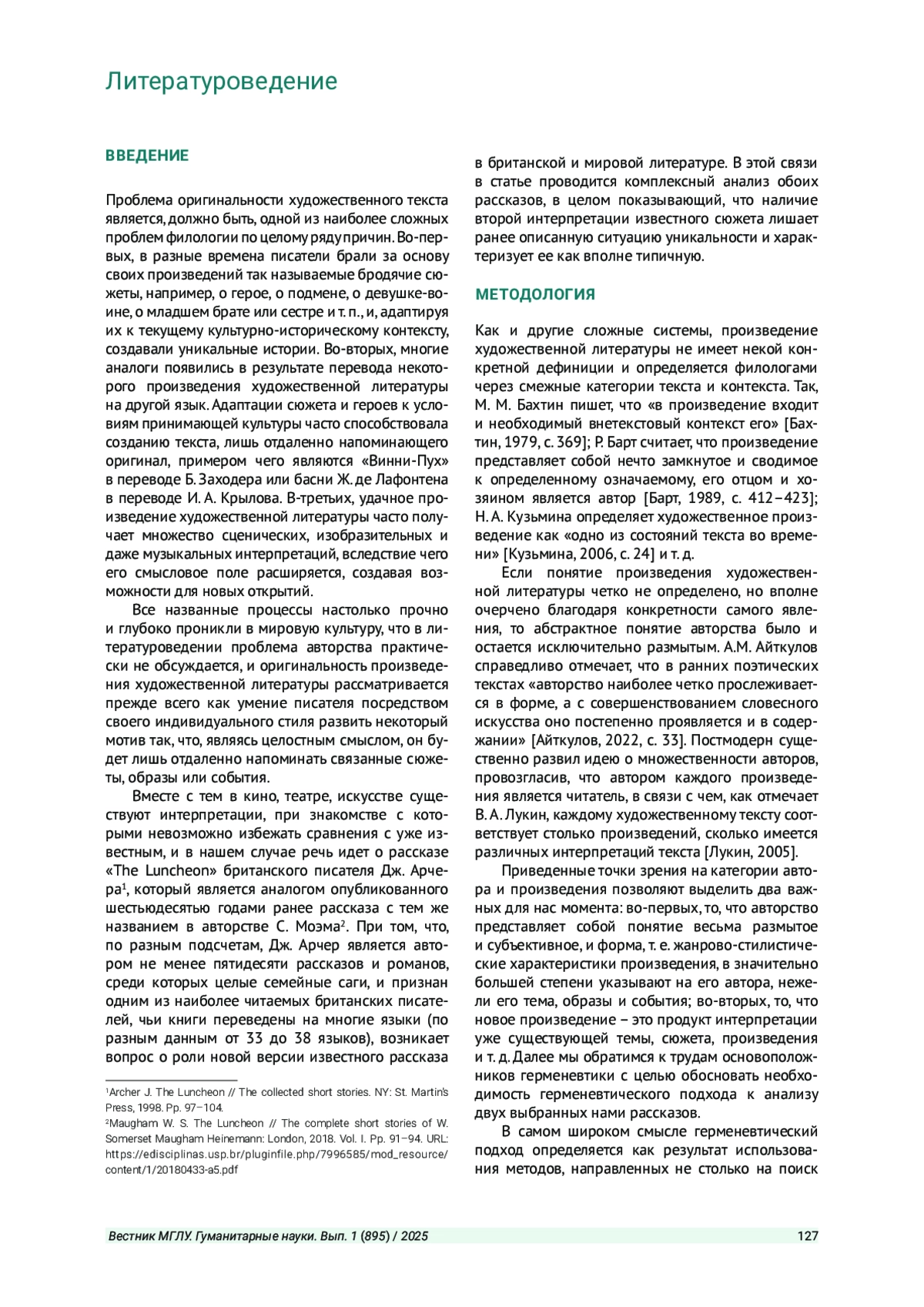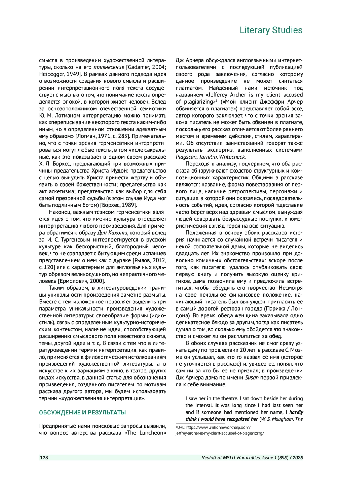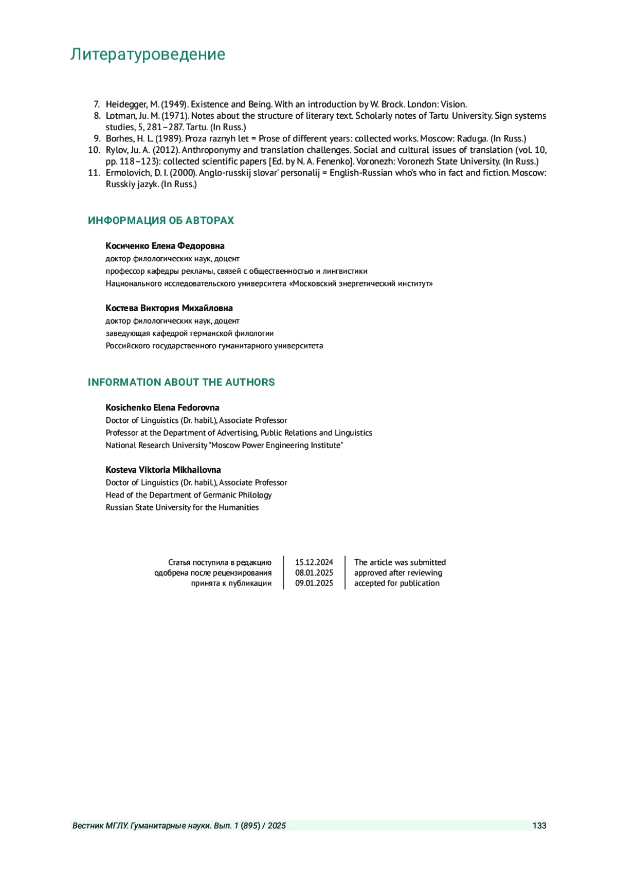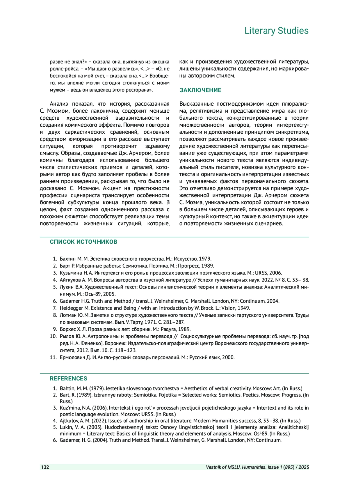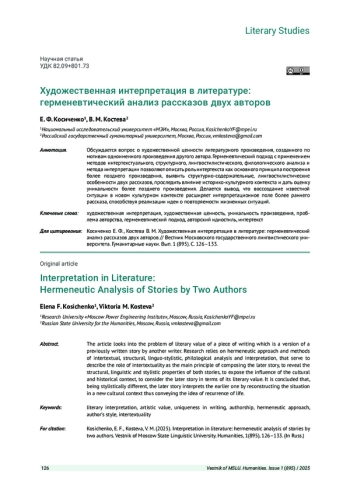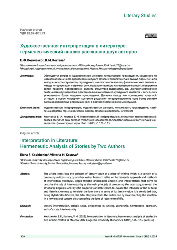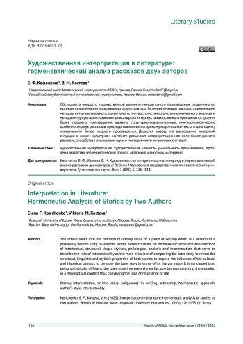 КОСИЧЕНКО Е. Ф., КОСТЕВА В. М. ХУДОЖЕСТВЕННАЯ ИНТЕРПРЕТАЦИЯ В ЛИТЕРАТУРЕ: ГЕРМЕНЕВТИЧЕСКИЙ АНАЛИЗ РАССКАЗОВ ДВУХ АВТОРОВ // ВЕСТНИК МОСКОВСКОГО ГОСУДАРСТВЕННОГО ЛИНГВИСТИЧЕСКОГО УНИВЕРСИТЕТА. ГУМАНИТАРНЫЕ НАУКИ. 2025. № 1 (895)