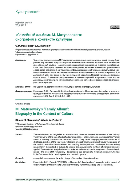 Творчество поэта-песенника М. Матусовского известно далеко за пределами нашей страны. Внутренний мир человека искусства отражает мемуаристика - письма, воспоминания, автобиографии. «Семейный альбом» - единственное прозаическое произведение писателя, своеобразный ключ к его биографии, содержит воспоминания детства, зарисовки военных лет, размышления о творчестве, впечатления о путешествиях. Цель исследования обусловлена актуальностью изучения жизненного пути и творчества выдающегося поэта-песенника в контексте культуры. Для достижения цели применялись научные методы мемуаристики. Проведенный анализ позволил сделать вывод об уникальности аутентичного источника - прозы М. Матусовского - для воссоздания подлинного портрета исторической личности, его роли в формировании творческого жанра, в целом культуры.