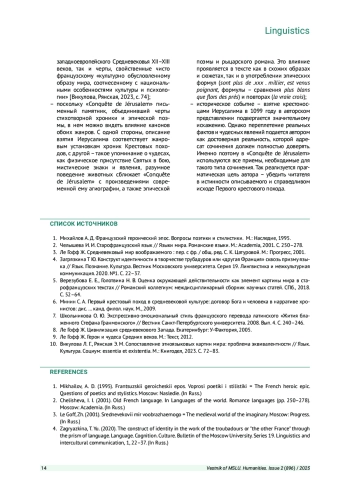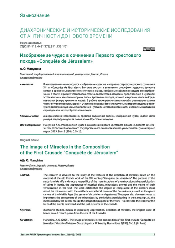 МАНУХИНА А. О. ИЗОБРАЖЕНИЕ ЧУДЕС В СОЧИНЕНИИ ПЕРВОГО КРЕСТОВОГО ПОХОДА «CONQUÊTE DE JÉRUSALEM» // ВЕСТНИК МОСКОВСКОГО ГОСУДАРСТВЕННОГО ЛИНГВИСТИЧЕСКОГО УНИВЕРСИТЕТА. ГУМАНИТАРНЫЕ НАУКИ. 2025. № 2 (896)