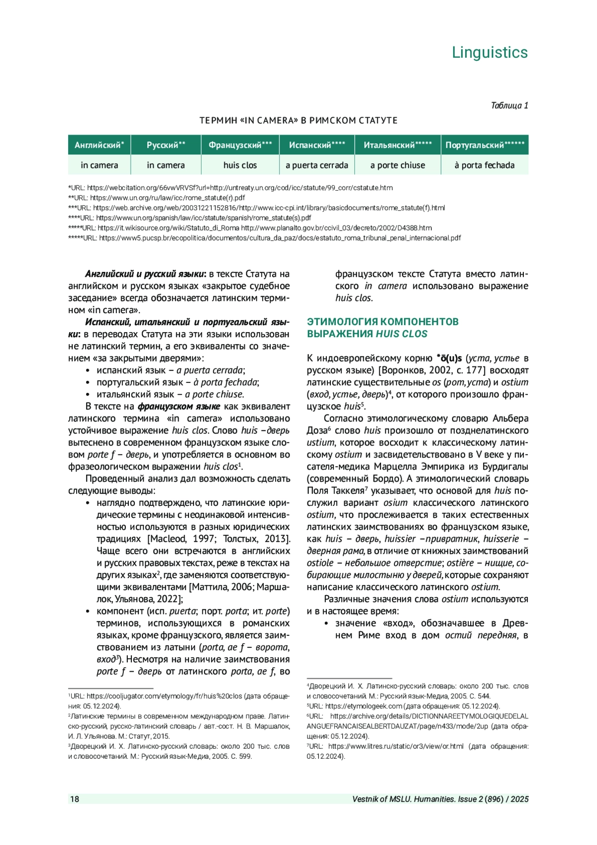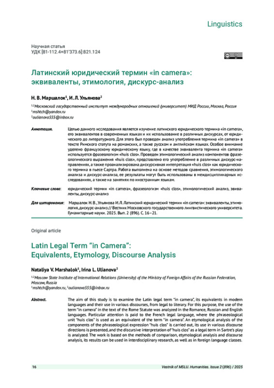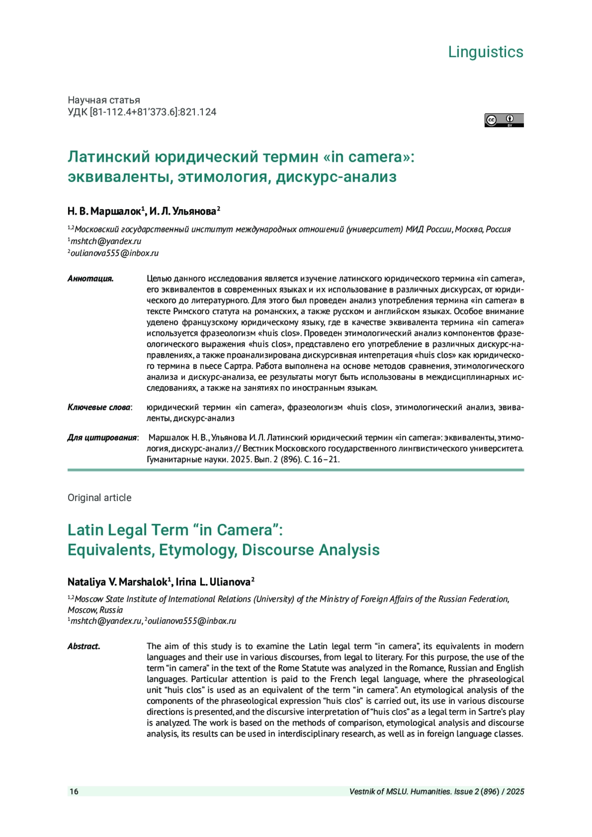 Целью данного исследования является изучение латинского юридического термина «in camera», его эквивалентов в современных языках и их использование в различных дискурсах, от юридического до литературного. Для этого был проведен анализ употребления термина «in camera» в тексте Римского статута на романских, а также русском и английском языках. Особое внимание уделено французскому юридическому языку, где в качестве эквивалента термина «in camera» используется фразеологизм «huis clos». Проведен этимологический анализ компонентов фразеологического выражения «huis clos», представлено его употребление в различных дискурс-направлениях, а также проанализирована дискурсивная интепретация «huis clos» как юридического термина в пьесе Сартра. Работа выполнена на основе методов сравнения, этимологического анализа и дискурс-анализа, ее результаты могут быть использованы в междисциплинарных исследованиях, а также на занятиях по иностранным языкам.