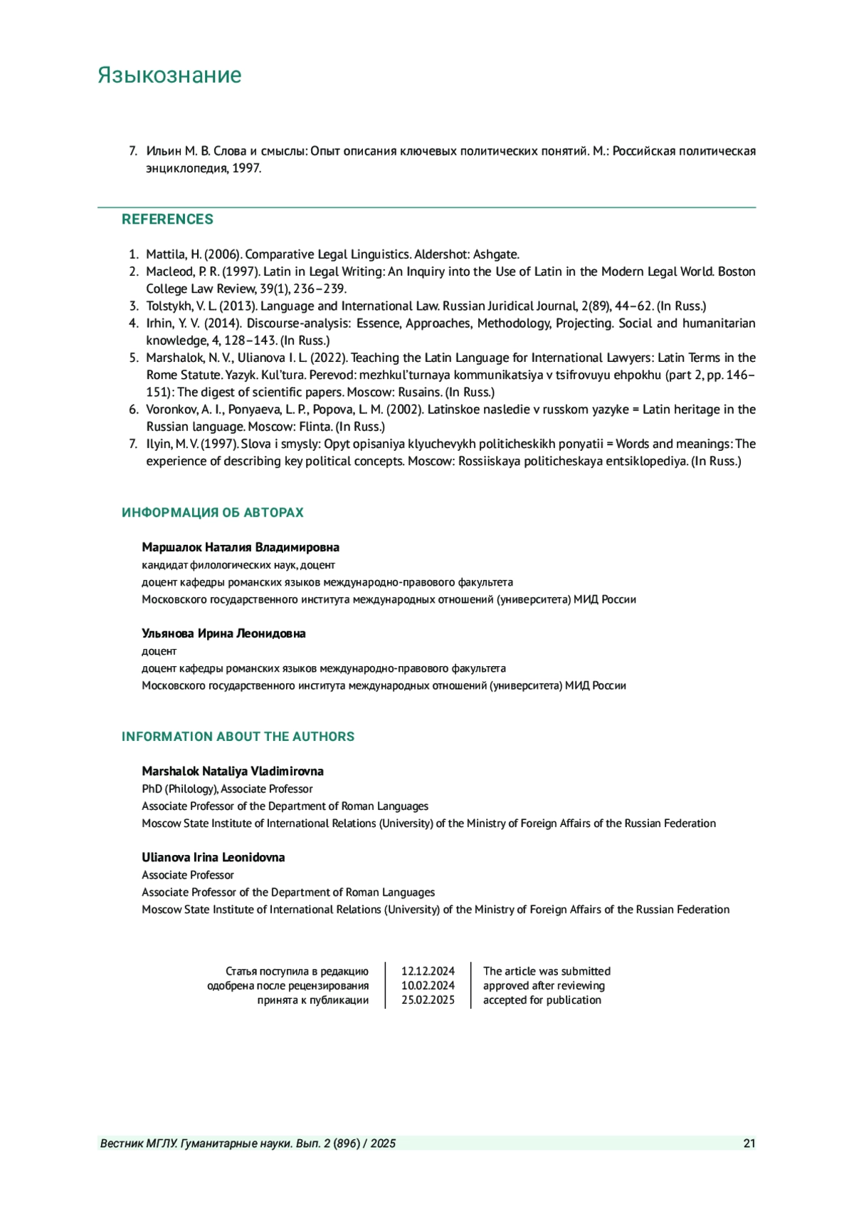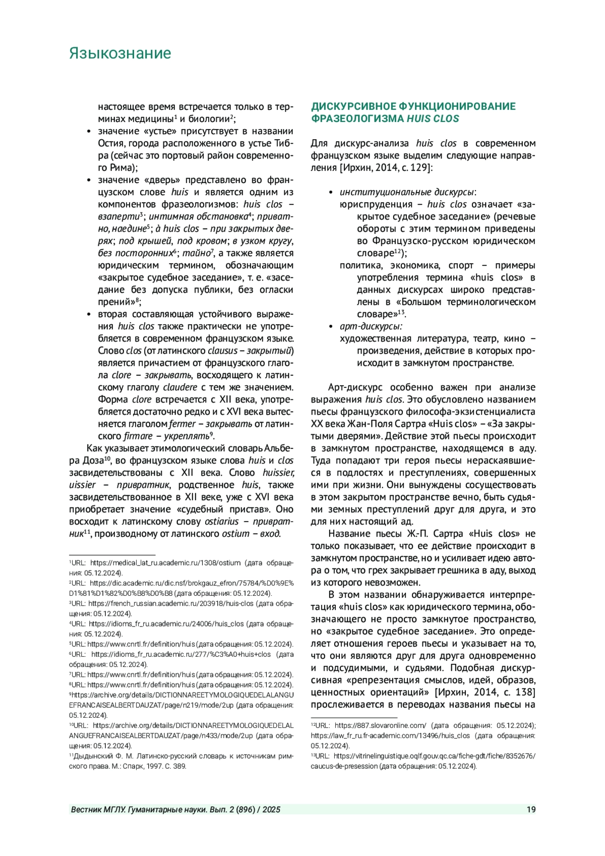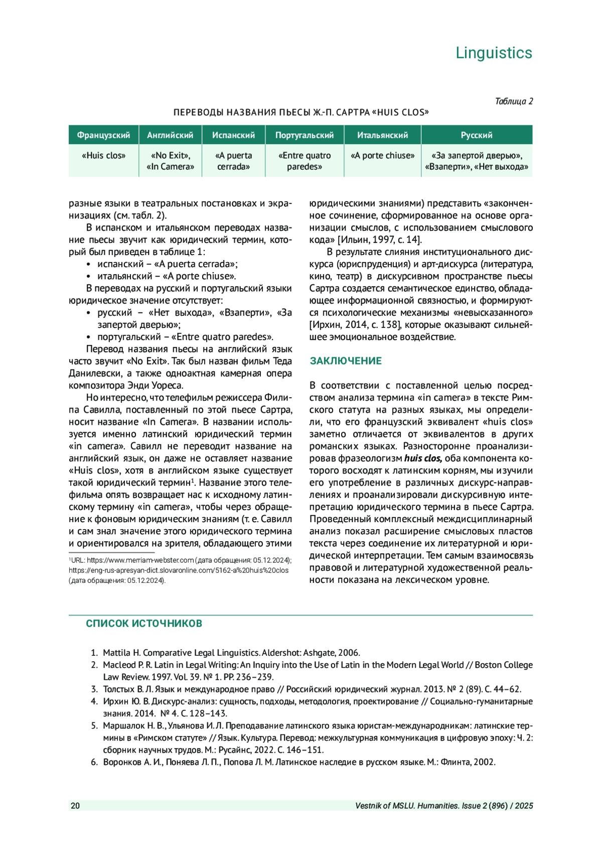 Целью данного исследования является изучение латинского юридического термина «in camera», его эквивалентов в современных языках и их использование в различных дискурсах, от юридического до литературного. Для этого был проведен анализ употребления термина «in camera» в тексте Римского статута на романских, а также русском и английском языках. Особое внимание уделено французскому юридическому языку, где в качестве эквивалента термина «in camera» используется фразеологизм «huis clos». Проведен этимологический анализ компонентов фразеологического выражения «huis clos», представлено его употребление в различных дискурс-направлениях, а также проанализирована дискурсивная интепретация «huis clos» как юридического термина в пьесе Сартра. Работа выполнена на основе методов сравнения, этимологического анализа и дискурс-анализа, ее результаты могут быть использованы в междисциплинарных исследованиях, а также на занятиях по иностранным языкам.