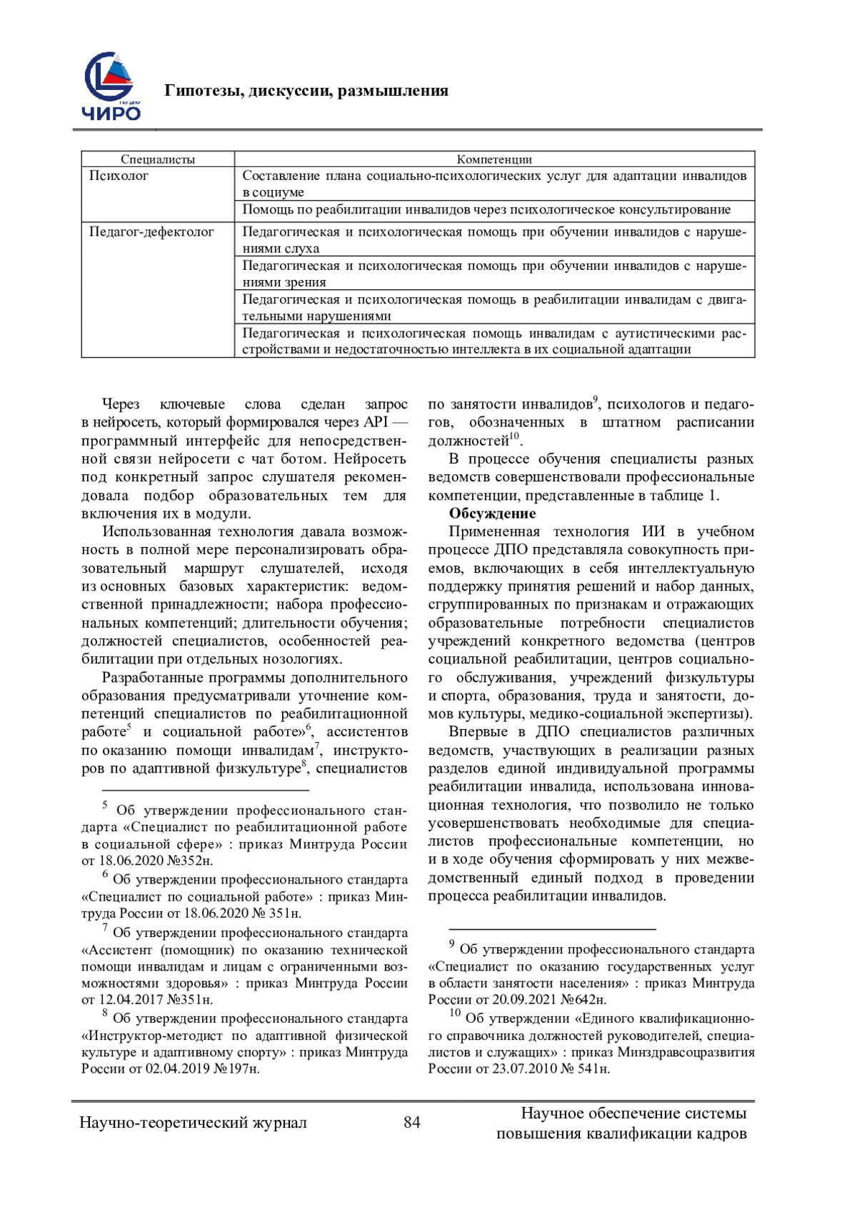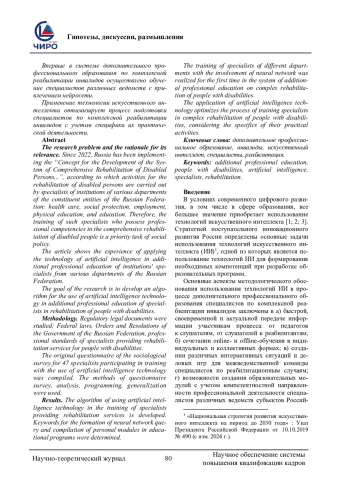 Проблема исследования и обоснование ее актуальности. В России с 2022 г. реализуется «Концепция развития системы комплексной реабилитации инвалидов…», согласно которой мероприятия по реабилитации инвалидов осуществляются специалистами учреждений различных ведомств субъектов Российской Федерации: здравоохранения, социальной защиты, занятости, физкультуры, образования. Поэтому подготовка таких специалистов, владеющих профессиональными компетенциями по комплексной реабилитации инвалидов, является приоритетной задачей социальной политики. В работе показан опыт применения технологии искусственного интеллекта в дополнительном профессиональном образовании специалистов учреждений различных ведомств субъектов Российской Федерации. Цель - разработать алгоритм использования технологии искусственного интеллекта в дополнительном профессиональном образовании специалистов по реабилитации инвалидов. Материалы и методы. Были изучены нормативно-правовые документы: федеральные законы, распоряжения и постановления Правительства Российской Федерации, профессиональные стандарты специалистов, предоставляющих услуги по реабилитации инвалидов. Составлена оригинальная анкета социологического опроса для 47 специалистов, участвующих в обучении с использованием технологии искусственного интеллекта. Использованы методы анкетирования, анализа, программирования, обобщения. Результаты. Разработан алгоритм использования технологии искусственного интеллекта при обучении специалистов, оказывающих реабилитационные услуги. Определены ключевые слова для формирования запроса нейросети и составления персональных модулей в образовательных программах. Впервые в системе дополнительного профессионального образования по комплексной реабилитации инвалидов осуществлено обучение специалистов различных ведомств с привлечением нейросети. Применение технологии искусственного интеллекта оптимизирует процесс подготовки специалистов по комплексной реабилитации инвалидов с учетом специфики их практической деятельности.