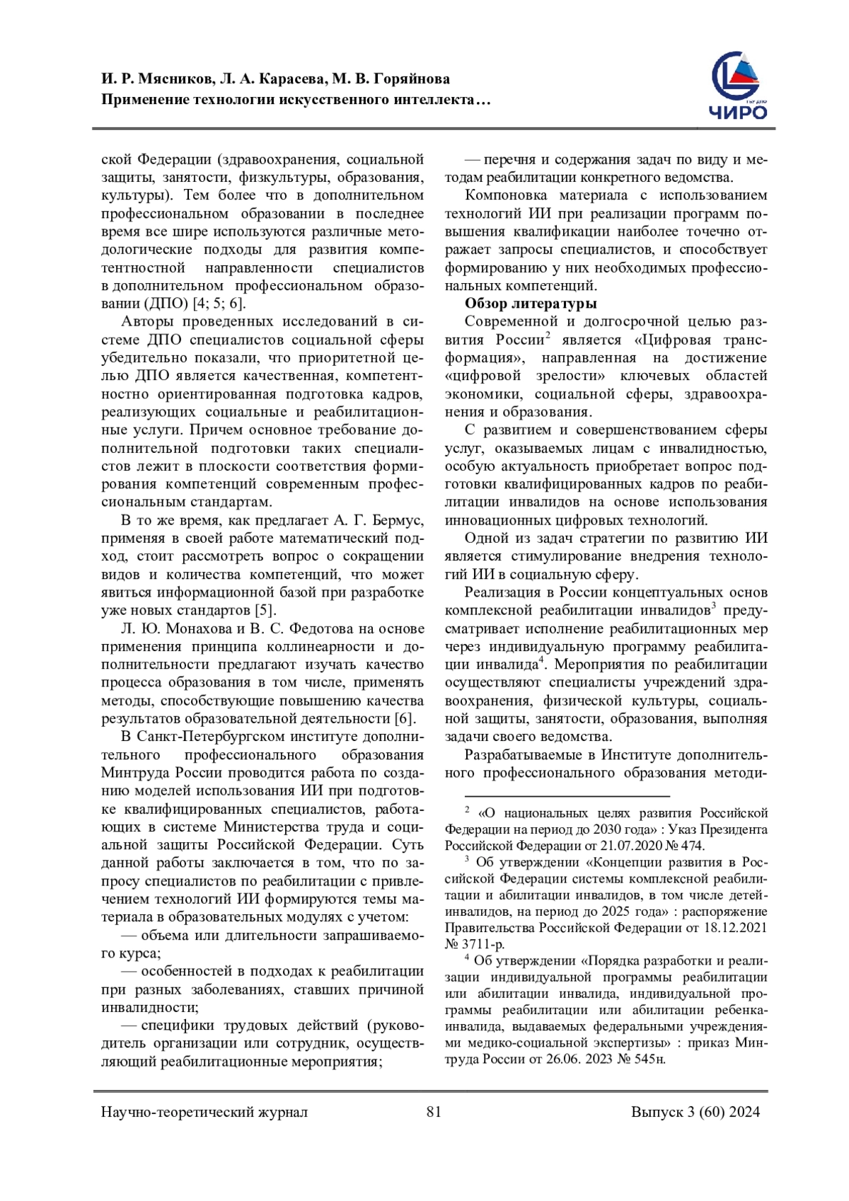 4. Карасаева, Л. А. Компетентностно ориентированное обучение специалистов социальной сферы по сопровождаемому проживанию / Л. А. Карасаева, М. В. Горяйнова, Е. С. Купцова и др. - Текст: непосредственный // Вестник Всероссийского общества специалистов по медико-социальной экспертизе, реабилитации и реабилитационной индустрии. - 2024. - № 1. - С. 7-15. EDN: ZZBASH