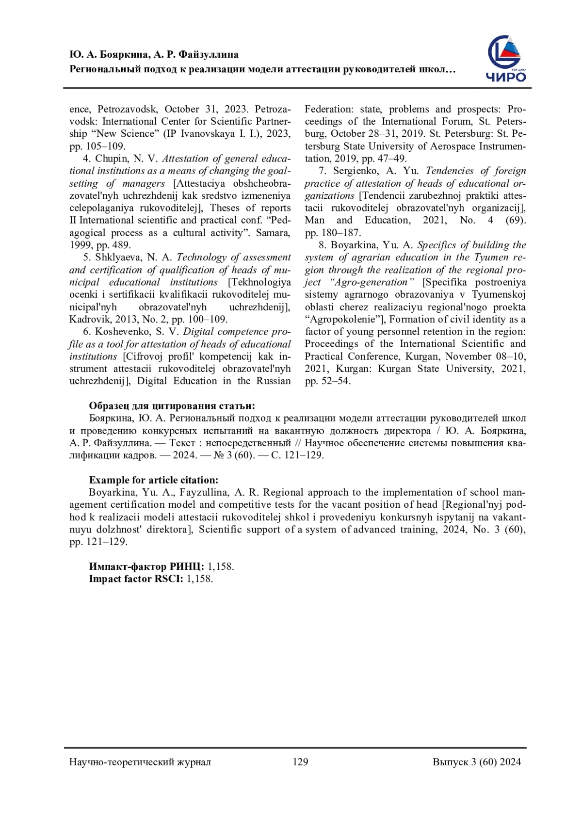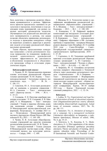 7. Сергиенко, А. Ю. Тенденции зарубежной практики аттестации руководителей образовательных организаций / А. Ю. Сергиенко. - Текст: непосредственный // Человек и образование - 2021. - № 4 (69). - C. 180-187.