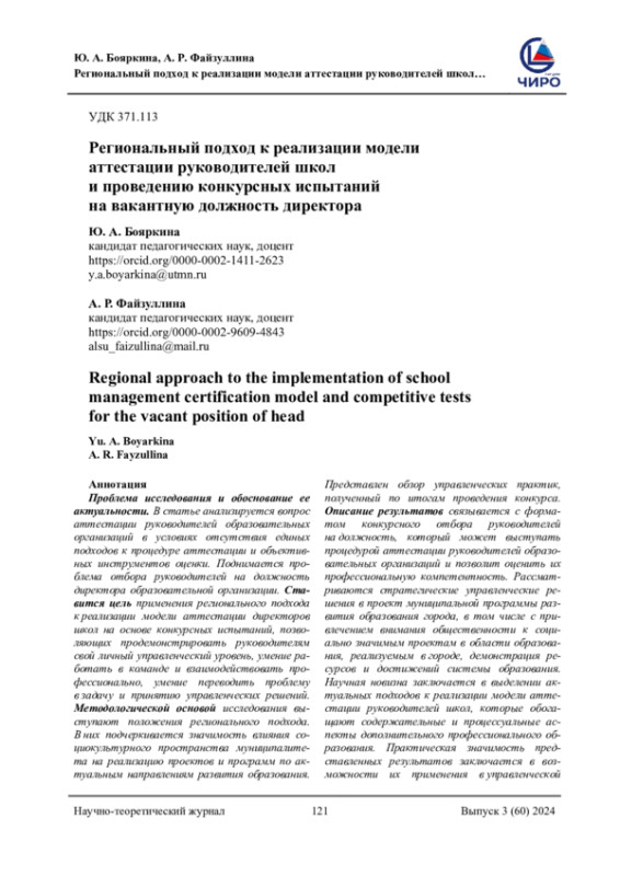 Проблема исследования и обоснование ее актуальности. В статье анализируется вопрос аттестации руководителей образовательных организаций в условиях отсутствия единых подходов к процедуре аттестации и объективных инструментов оценки. Поднимается проблема отбора руководителей на должность директора образовательной организации. Ставится цель применения регионального подхода к реализации модели аттестации директоров школ на основе конкурсных испытаний, позволяющих продемонстрировать руководителям свой личный управленческий уровень, умение работать в команде и взаимодействовать профессионально, умение переводить проблему в задачу и принятию управленческих решений. Методологической основой исследования выступают положения регионального подхода. В них подчеркивается значимость влияния социокультурного пространства муниципалитета на реализацию проектов и программ по актуальным направлениям развития образования. Представлен обзор управленческих практик, полученный по итогам проведения конкурса. Описание результатов связывается с форматом конкурсного отбора руководителей на должность, который может выступать процедурой аттестации руководителей образовательных организаций и позволит оценить их профессиональную компетентность. Рассматриваются стратегические управленческие решения в проект муниципальной программы развития образования города, в том числе с привлечением внимания общественности к социально значимым проектам в области образования, реализуемым в городе, демонстрация ресурсов и достижений системы образования. Научная новизна заключается в выделении актуальных подходов к реализации модели аттестации руководителей школ, которые обогащают содержательные и процессуальные аспекты дополнительного профессионального образования. Практическая значимость представленных результатов заключается в возможности их применения в управленческой практике и повышении квалификации руководящих кадров и реализации программы профессиональной переподготовки «Менеджмент организации». Обсуждаются условия и ограничения в применении предложенных решений, обоснована их результативность.