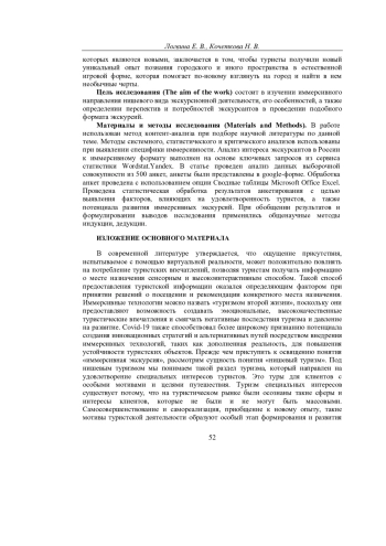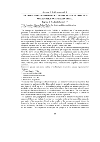 Статья посвящена иммерсионным экскурсиям и применению виртуальной реальности, как инновационной форме экскурсионных услуг. Проанализированы работы, посвященные исследованию иммерсивных экскурсий, рассмотрены их особенности и проявления, а также технологии иммерсивных экскурсий. Обозначены особенности и сгруппированы виды иммерсивных экскурсий по форме постановки и тематике. На основе поисковых запросов в системе «Яндекс» изучены динамика и географическое распределение интереса к иммерсивным экскурсиям в регионах России. В работе осуществлен опрос на предмет предпочтений элементов и тематики экскурсий. По результатам оценки анкетирования выявили: интерес к инновационным формам экскурсий; предпочтительные элементы иммерсивности; факторы, влияющие на выбор экскурсии; а также тематические предпочтения потребителей данной услуги. Выявлены конкурентные преимущества и перспективы иммерсивного формата.