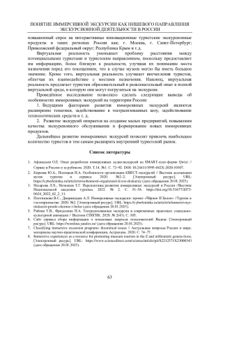 3. Назарова Л.Х., Незнанов Т.Г. Перспективы развития иммерсивных экскурсий в России //Вестник Национальной академии туризма. 2022. № 2. С. 51-54. DOI: 10.51677/2073-0624_2022_62_2_11 EDN: TBKVUL