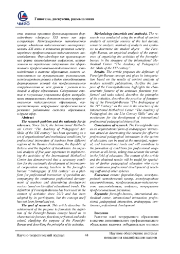 Ключевые фразы: форсайт-бюро, международный методический центр, международное взаимодействие, профессионально-педагогическое взаимодействие, андрагог, непрерывное профессиональное развитие