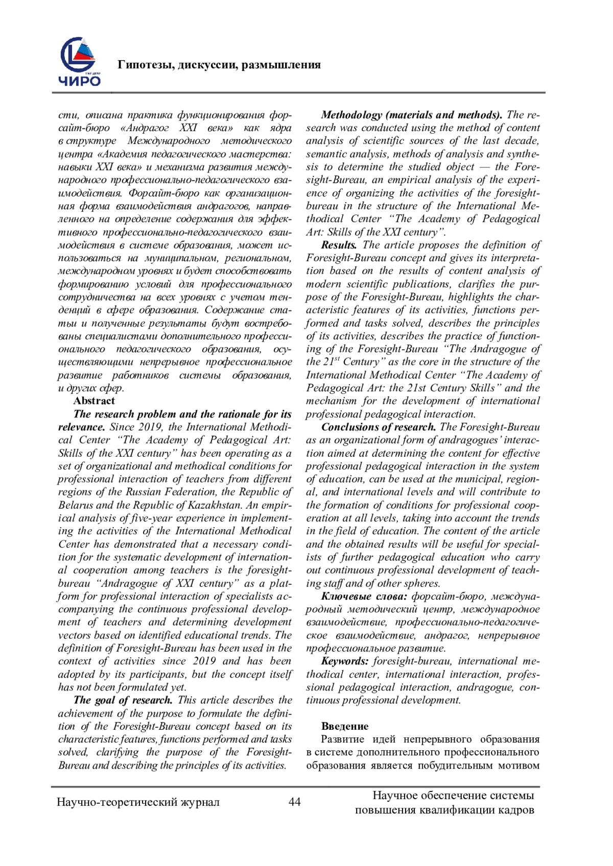 Проблема исследования и обоснование ее актуальности. С 2019 года осуществляется деятельность Международного методического центра «Академия педагогического мастерства: навыки XХI века» как комплекса организационно-методических условий для профессионального взаимодействия педагогических работников из разных областей Российской Федерации, Республики Беларусь и Республики Казахстан. Эмпирический анализ пятилетнего опыта реализации мероприятий Международного методического центра продемонстрировал, что необходимым условием планомерного развития международного сотрудничества педагогов является форсайт-бюро «Андрагог XХI века» как площадка для эффективного профессионального взаимодействия специалистов, сопровождающих непрерывное профессиональное развитие педагогических работников и определяющих векторы развития на основе выявленных тенденций в сфере образования. Дефиниция «форсайт-бюро» используется в контексте деятельности с 2019 года и принята его участниками, однако само понятие не сформулировано.