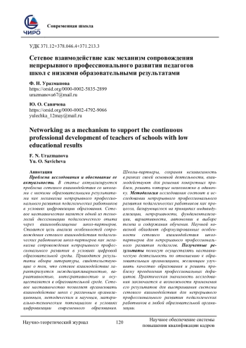 Проблема исследования и обоснование ее актуальности. В статье актуализируется проблема сетевого взаимодействия со школами с низкими образовательными результатами как механизма непрерывного профессионального развития педагогических работников в условиях цифровизации образования. Сетевое наставничество является одной из технологий диссеминации педагогического опыта через взаимообогащение школ-партнеров. Ставится цель анализа особенностей сопровождения сетевого взаимодействия педагогических работников школ-партнеров как механизма сопровождения непрерывного профессионального развития в условиях цифровой образовательной среды. Приводятся результаты обзора литературы, свидетельствующие о том, что сетевое взаимодействие характеризуется междисциплинарностью, вариативностью, интегративностью и осуществляется в образовательной среде. Сетевое наставничество позволяет организовать взаимодействие школ с различным организационным, методическим и научным, материально-техническим потенциалом в условиях цифровизации современного образования. Школы-партнеры, сохраняя независимость в рамках своей основной деятельности, взаимодействуют для решения конкретных проблем, решить которые невозможно в одиночку. Методология исследования состоит в исследовании непрерывного профессионального развития педагогических работников как процесса, базирующегося на принципах индивидуализации, непрерывности, фундаментализации, вариативности, автономии в выборе темпа и содержания обучения. Научной новизной обладают сформулированные особенности сетевого взаимодействия школ-партнеров для непрерывного профессионального развития педагогов. Полученные результаты помогут осуществлять наставническую деятельность по отношению к образовательным организациям, желающим улучшить качество образования и решить проблему преодоления профессиональных дефицитов. Практическая значимость исследования заключается в возможности применения его результатов для выстраивания системы сетевого взаимодействия для непрерывного профессионального развития педагогических работников в любой образовательной организации.