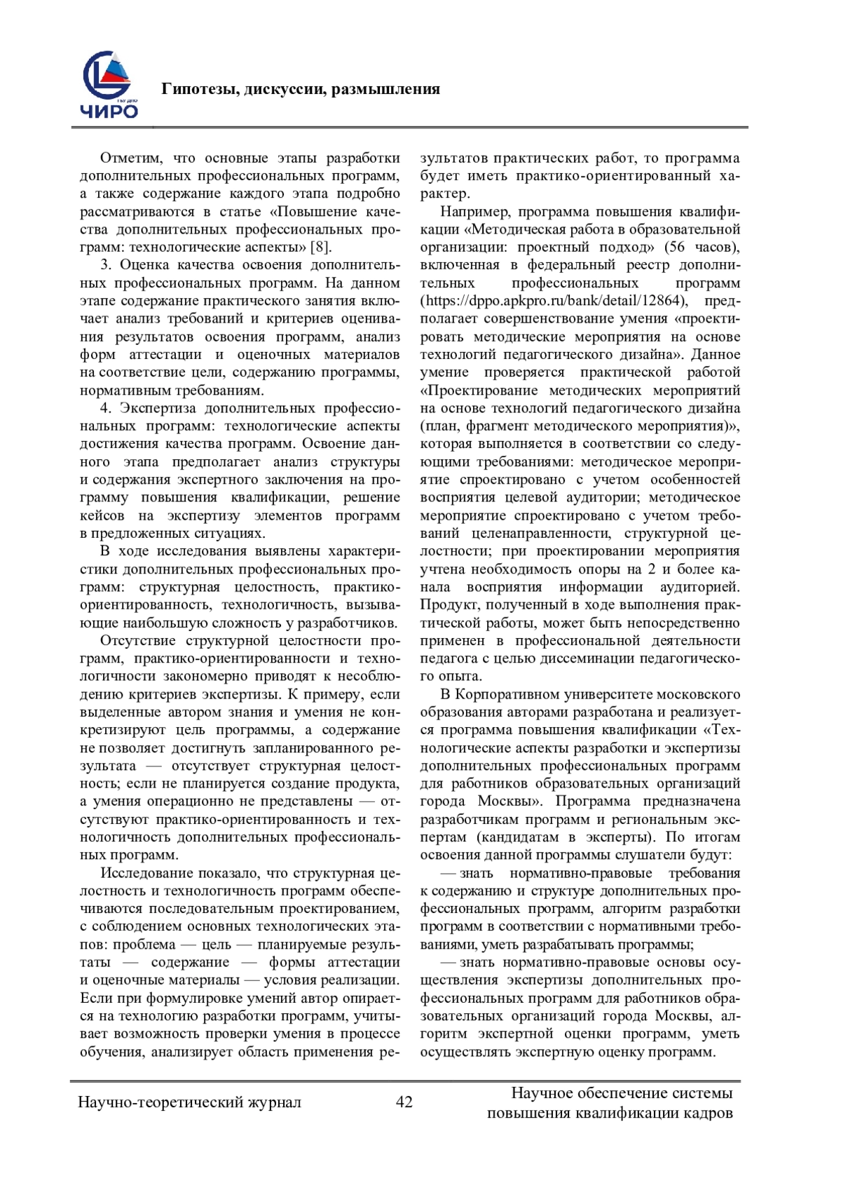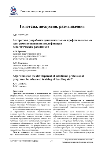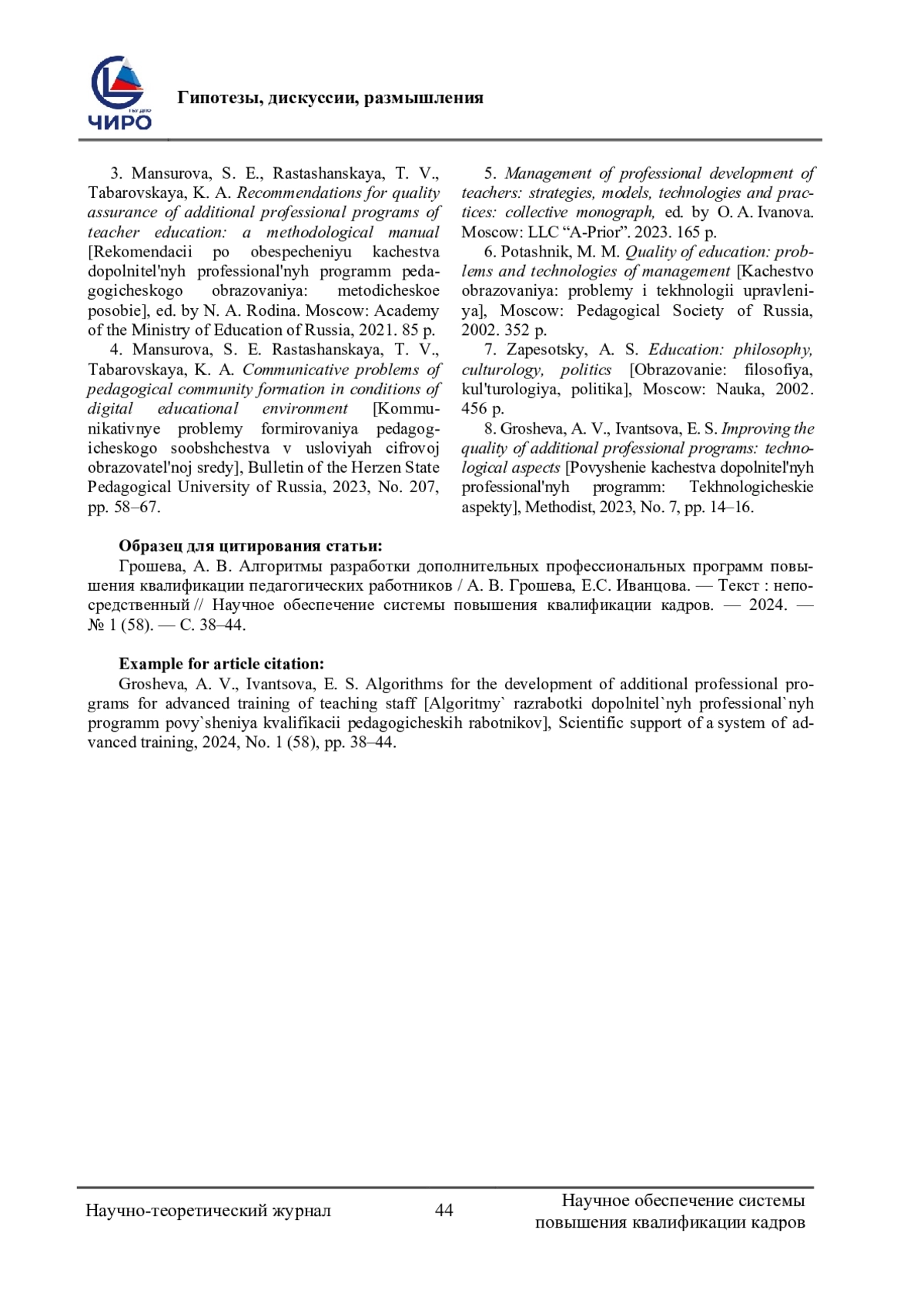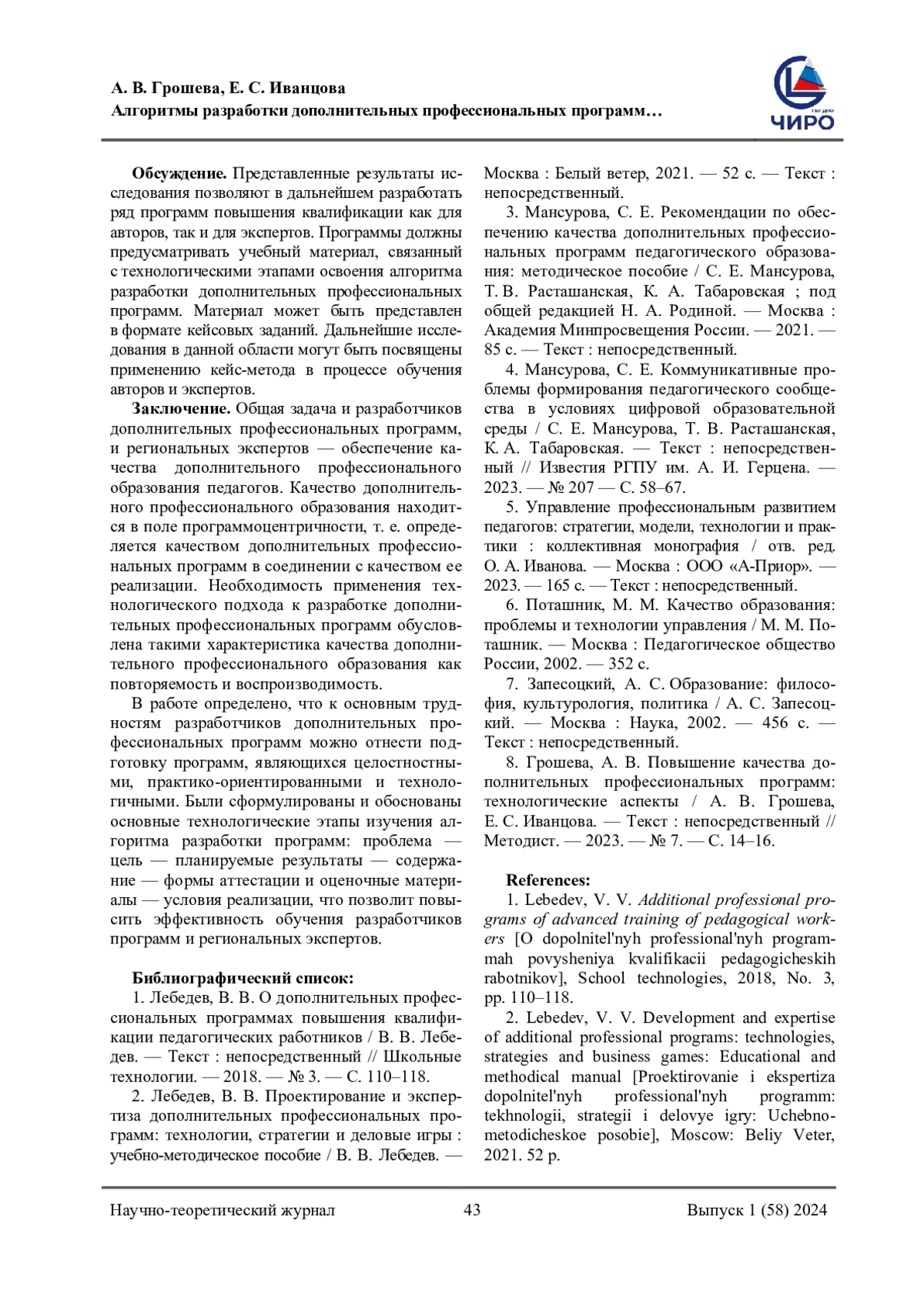 8. Грошева, А. В. Повышение качества дополнительных профессиональных программ: технологические аспекты / А. В. Грошева, Е. С. Иванцова. - Текст: непосредственный // Методист. - 2023. - № 7. - С. 14-16. EDN: PVBKGT
