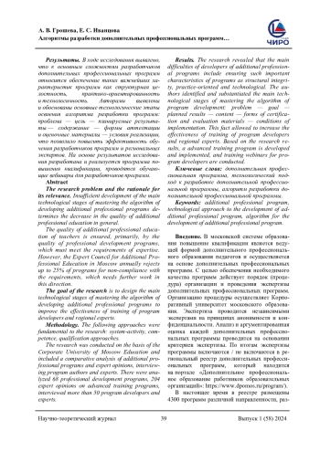 Проблема исследования и обоснование ее актуальности. Недостаточная разработанность основных технологических этапов освоения алгоритма разработки дополнительных профессиональных программ определяет снижение качества дополнительного профессионального образования в целом. Качество дополнительного профессионального образования педагогов обеспечивается, в первую очередь, качеством программ повышения квалификации, которые должны соответствовать требованиям экспертизы. Однако экспертным советом по дополнительному профессиональному образованию в городе Москве ежегодно отклоняются до 25% программ за несоответствие требованиям, что требует продолжения работы в данном направлении. Цель исследования: проектирование основных технологических этапов освоения алгоритма разработки дополнительных профессиональных программ для повышения эффективности обучения разработчиков программ и региональных экспертов. Методология (материалы и методы). При проведении исследования основополагающими являлись следующие подходы: системно-деятельностный, компетентностный, квалификационный. Исследование было проведено на базе Корпоративного университета московского образования и включало сравнительный анализ дополнительных профессиональных программ и экспертных заключений, интервьюирование авторов программ, экспертов. Было проанализировано 68 программ повышения квалификации, 204 экспертных заключения на программы повышения квалификации, опрошено более 50 разработчиков программ и экспертов.