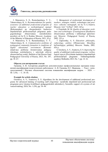 3. Мансурова, С. Е. Рекомендации по обеспечению качества дополнительных профессиональных программ педагогического образования: методическое пособие / С. Е. Мансурова, Т. В. Расташанская, К. А. Табаровская; под общей редакцией Н. А. Родиной. - Москва: Академия Минпросвещения России. - 2021. - 85 с. - Текст: непосредственный.