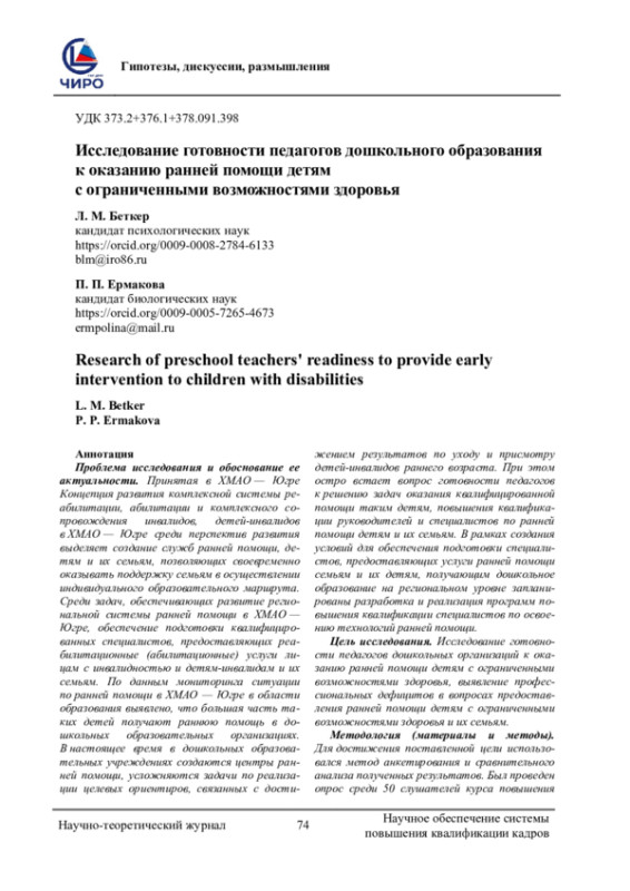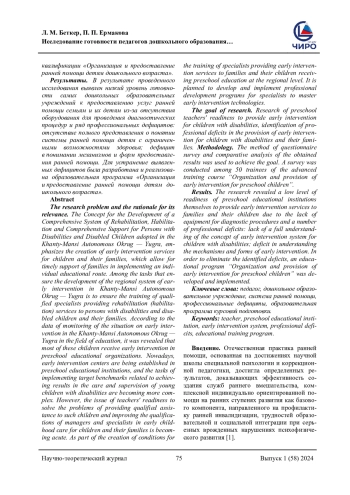 Проблема исследования и обоснование ее актуальности. Принятая в ХМАО - Югре Концепция развития комплексной системы реабилитации, абилитации и комплексного сопровождения инвалидов, детей-инвалидов в ХМАО - Югре среди перспектив развития выделяет создание служб ранней помощи, детям и их семьям, позволяющих своевременно оказывать поддержку семьям в осуществлении индивидуального образовательного маршрута. Среди задач, обеспечивающих развитие региональной системы ранней помощи в ХМАО - Югре, обеспечение подготовки квалифицированных специалистов, предоставляющих реабилитационные (абилитационные) услуги лицам с инвалидностью и детям-инвалидам и их семьям. По данным мониторинга ситуации по ранней помощи в ХМАО - Югре в области образования выявлено, что большая часть таких детей получают раннюю помощь в дошкольных образовательных организациях. В настоящее время в дошкольных образовательных учреждениях создаются центры ранней помощи, усложняются задачи по реализации целевых ориентиров, связанных с достижением результатов по уходу и присмотру детей-инвалидов раннего возраста. При этом остро встает вопрос готовности педагогов к решению задач оказания квалифицированной помощи таким детям, повышения квалификации руководителей и специалистов по ранней помощи детям и их семьям. В рамках создания условий для обеспечения подготовки специалистов, предоставляющих услуги ранней помощи семьям и их детям, получающим дошкольное образование на региональном уровне запланированы разработка и реализация программ повышения квалификации специалистов по освоению технологий ранней помощи. Цель исследования. Исследование готовности педагогов дошкольных организаций к оказанию ранней помощи детям с ограниченными возможностями здоровья, выявление профессиональных дефицитов в вопросах предоставления ранней помощи детям с ограниченными возможностями здоровья и их семьям. Методология (материалы и методы). Для достижения поставленной цели использовался метод анкетирования и сравнительного анализа полученных результатов. Был проведен опрос среди 50 слушателей курса повышения квалификации «Организация и предоставление ранней помощи детям дошкольного возраста».