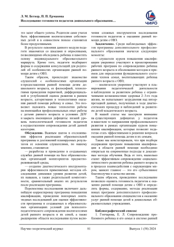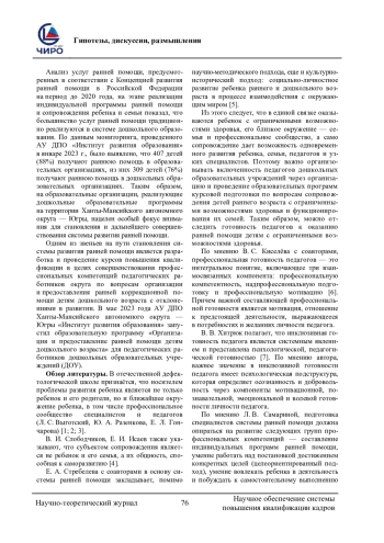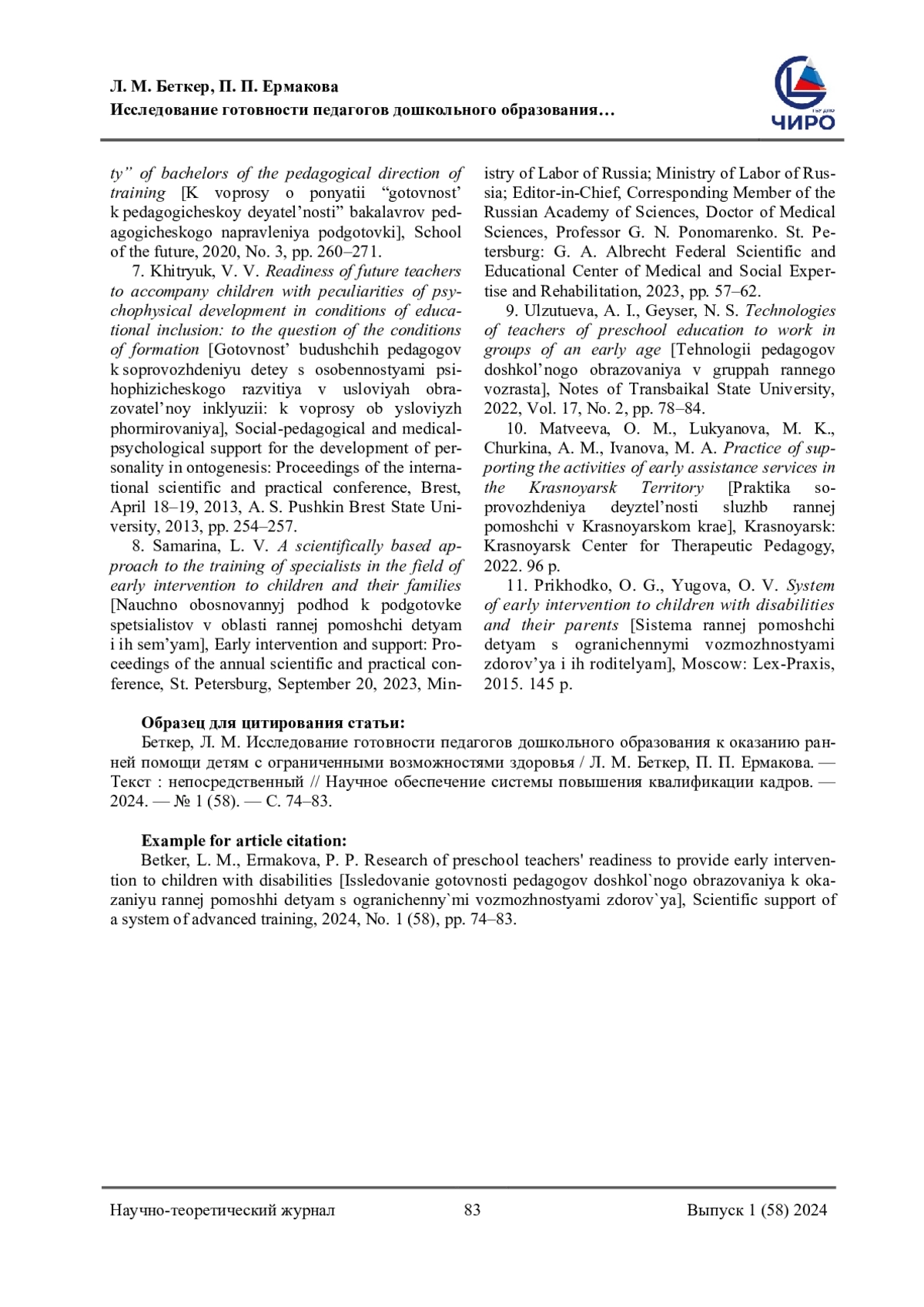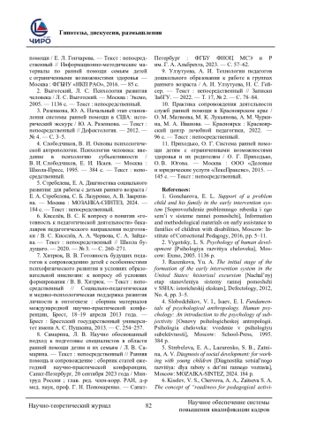 8. Самарина, Л. В. Научно обоснованный подход к подготовке специалистов в области ранней помощи детям и их семьям / Л. В. Самарина. - Текст: непосредственный // Ранняя помощь и сопровождение: сборник статей ежегодной научно-практической конференции, Санкт-Петербург, 20 сентября 2023 года / Минтруд России; глав. ред. член-корр. РАН, д-р мед. наук, проф. Г. Н. Пономаренко. - Санкт-Петербург: ФГБУ ФНОЦ МСЭ и Р им. Г. А. Альбрехта, 2023. - С. 57-62. EDN: AQRESI