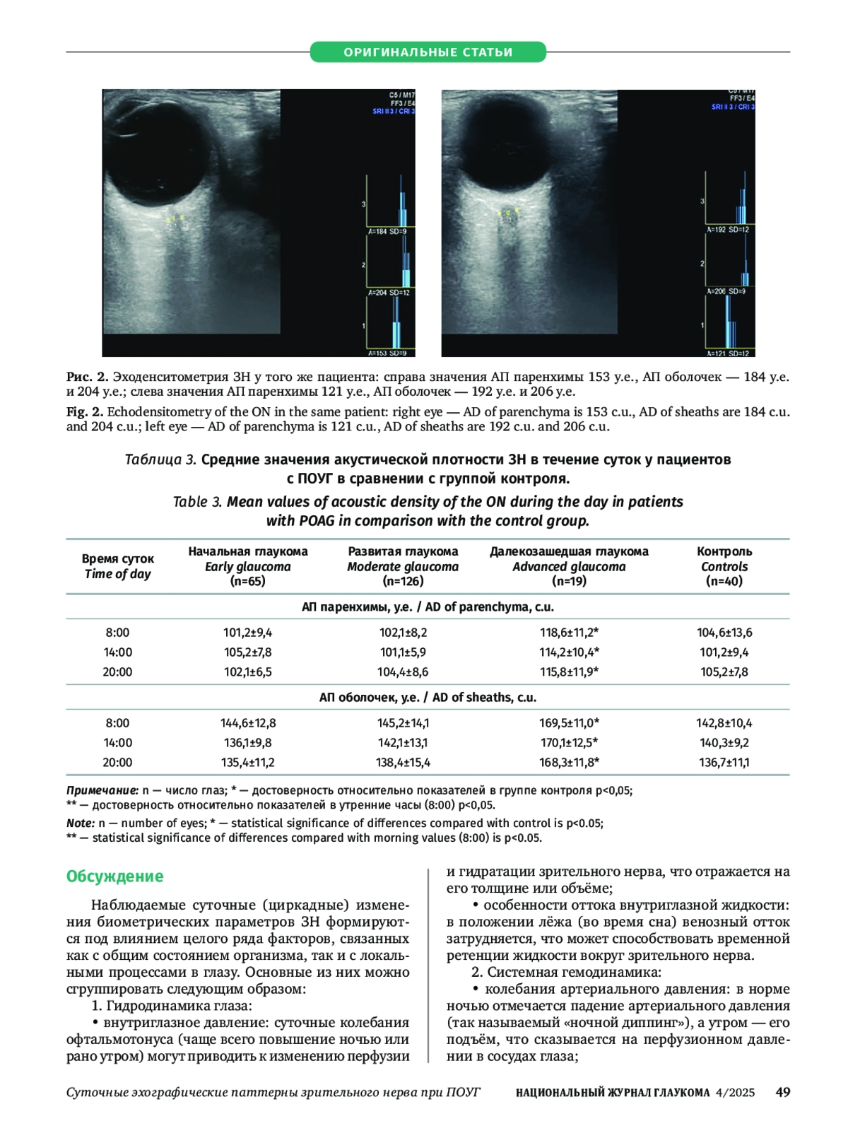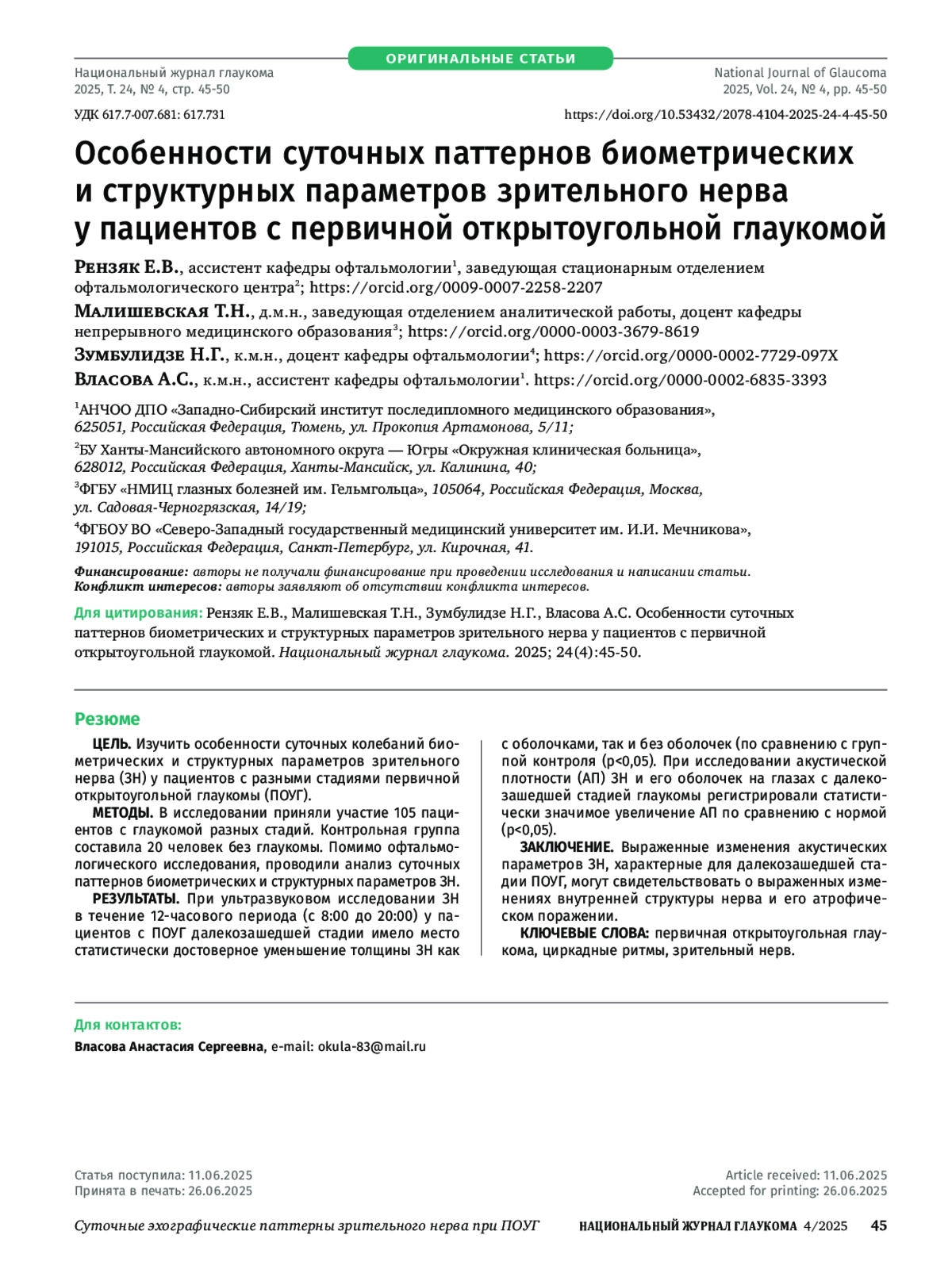 Статья: Особенности суточных паттернов биометрических и структурных параметров зрительного нерва у пациентов с первичной открытоугольной глаукомой (2025)