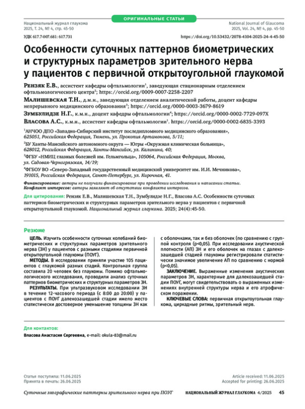 ЗУМБУЛИДЗЕ Н. Г., РЕНЗЯК Е. В., МАЛИШЕВСКАЯ Т. Н., ВЛАСОВА А.С. ОСОБЕННОСТИ СУТОЧНЫХ ПАТТЕРНОВ БИОМЕТРИЧЕСКИХ И СТРУКТУРНЫХ ПАРАМЕТРОВ ЗРИТЕЛЬНОГО НЕРВА У ПАЦИЕНТОВ С ПЕРВИЧНОЙ ОТКРЫТОУГОЛЬНОЙ ГЛАУКОМОЙ // НАЦИОНАЛЬНЫЙ ЖУРНАЛ ГЛАУКОМА. 2025. № 4, ТОМ 24