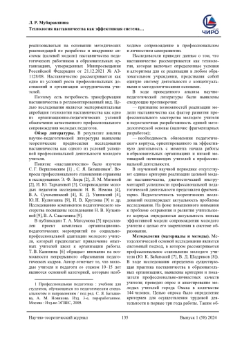 Проблема исследования и обоснование ее актуальности. В статье рассматривается вопрос о профессиональном становлении начинающего педагога и его закреплении в образовательных организациях. Отмечается проблема формирования педагогического коллектива и повышения профессионального уровня педагогов. Несмотря на рост требований к профессиональному мастерству педагогов, уровень их квалификации остается недостаточным. Педагогический корпус нуждается в обновлении с момента вхождения в профессию. Наблюдается низкая мотивация педагогических работников к совместной деятельности, направленной на их профессиональное развитие. Ставится цель представить результаты апробации технологии наставничества как одного из организационно-педагогических условий обеспечения качественного профессионального сопровождения молодых педагогов. Проводится обзор научных исследований, позволяющий установить значимость применения технологии наставничества в работе с педагогическим корпусом. Учитывается необходимость реализации в полном объеме государственной политики в сфере образования и поиском эффективной модели управления со стороны организации. Анализируются публикации, посвященные вопросу организации формального и информального образования учителей. Методологической основой исследования выступают положения системного и компетентного подходов. В них рассматривается становление психолого-педагогической компетентности молодого педагога. Проведен анализ нормативных документов с целью определения показателей уровня профессионального мастерства педагога. Описание результатов связывается с описанием модели наставнической деятельности, которая представлена авторской Программой наставничества. Программа включает перечень мероприятий по подбору основного педагога-наставника для молодого учителя, по определению наставнических групп с целью определения профессиональной траектории развития начинающего специалиста с учетом его профессиональных возможностей. В статье описан опыт внедрения Программы наставничества. Практическая значимость представленных результатов заключается в возможности их применения при принятии управленческих решений с целью создания условий для профессионального развития педагогов-наставников и закрепления в профессии наставляемых. Обсуждается диагностический инструментарий с целью выявления профессиональных возможностей и дефицитов молодых педагогов.