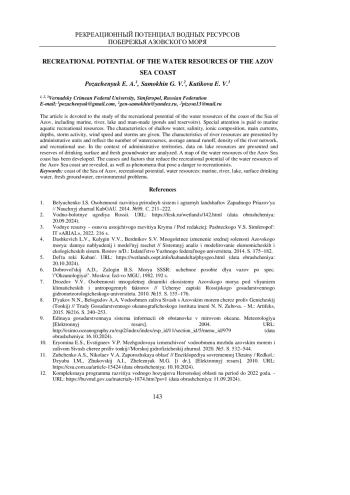 Статья посвящена исследованию рекреационного потенциала водных ресурсов побережья Азовского моря, включая морские, речные, озерные и природно-антропогенные (пруды и водохранилища). Особое внимание уделяется морским водным рекреационным ресурсам. Даны характеристики: мелководности, солености, ионного состава, основных течений, глубин, штормовой активности, скорости ветров и штормов. Характеристика речных ресурсов представлена по административным единицам и отражает количество водотоков, среднегодовой сток, густоту речной сети, рекреационное использование. В разрезе административных территорий приведены данные по ресурсам озер и проанализированы запасы питьевых поверхностных и пресных подземных вод. Разработана карта водных ресурсов побережья Азовского моря. Раскрыты причины и факторы, уменьшающие рекреационный потенциал водных ресурсов побережья Азовского моря, отмечены явления, представляющие опасность для рекреантов.
