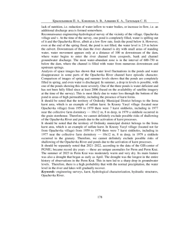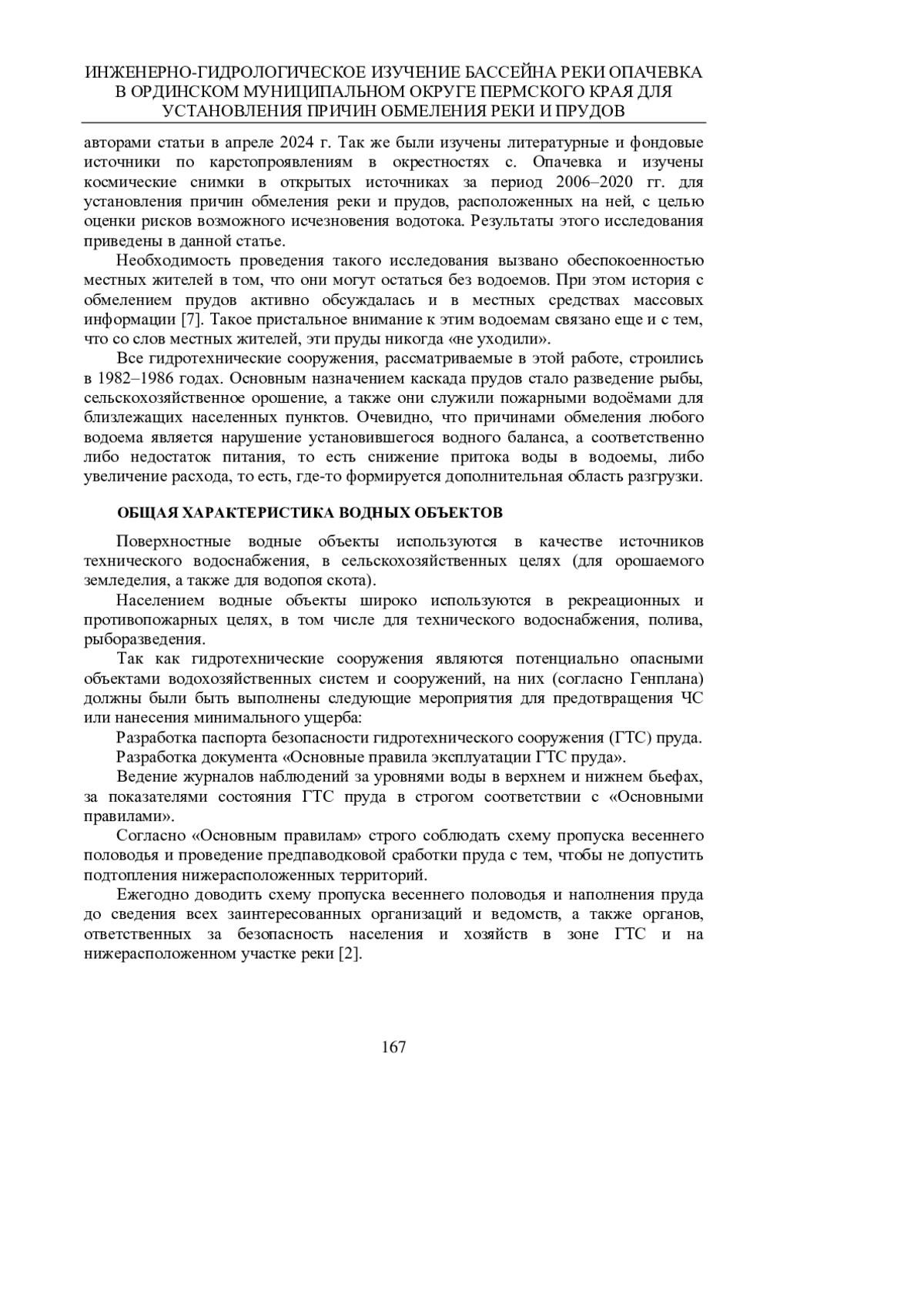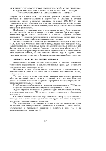 В работе приводятся результаты исследования инженерно-гидрологических условий бассейна р. Опачевка и каскада прудов, расположенных на ней. Актуальность исследования связана с тем, что со стороны Министерства природных ресурсов, лесного хозяйства и экологии Пермского края было направило обращение в адрес авторов для экспертной оценки влияния карстопроявлений на уровень воды в р. Опачевка. В своем обращении министерство просит оказать содействие в организации гидрологического обследования реки Опачевка в Ординском муниципальном округе на предмет ее возможного исчезновения, поскольку в течение 2021-2023 годов на этом водотоке высохли два пруда, в зимний период 2024 года произошло обмеление еще одного пруда в деревне Грибаны (уровень воды понизился на 1,5 м от нормального подпорного уровня). Исследования окрестностей с. Опачевка и д. Грибаны, а также водосборного бассейна р. Опачевка были проведены авторами статьи в апреле 2024 г. Так же были изучены литературные и фондовые источники по карстопроявлениям в окрестностях с. Опачевка, изучены космические снимки, опубликованные в открытых источниках за период 2006-2020 гг. для установления причин обмеления реки и прудов, расположенных на ней, с целью оценки рисков возможного исчезновения водотока. Результаты этого исследования приведены в данной статье.