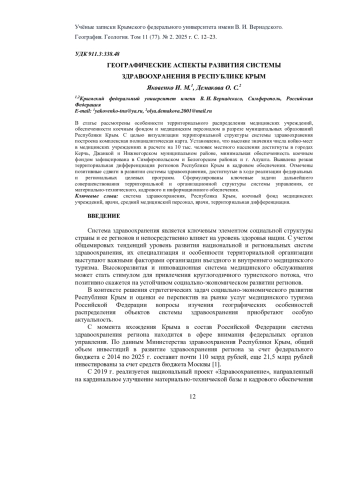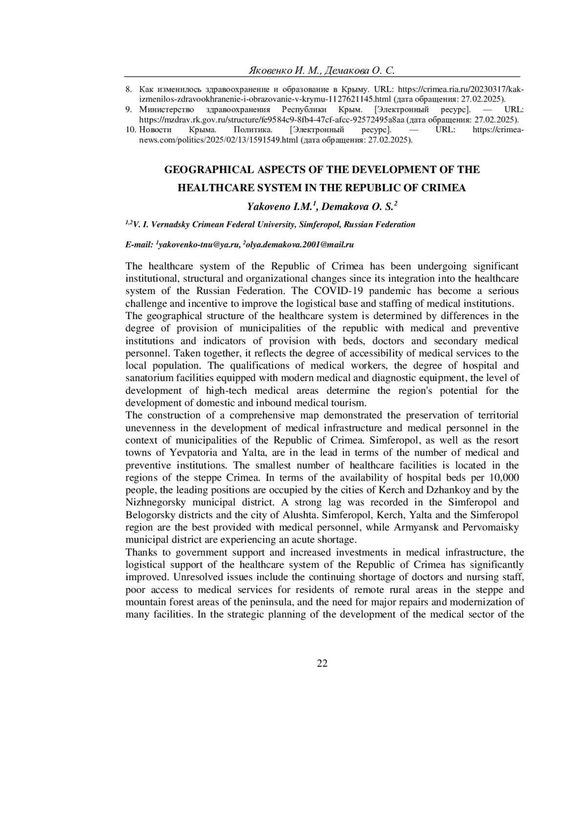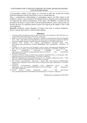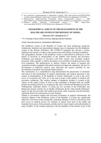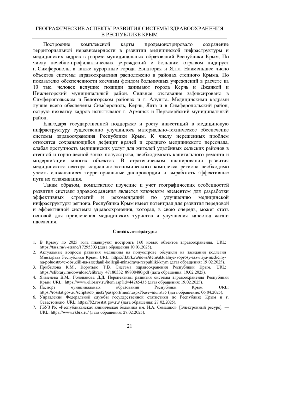 3. Прибылова К.М., Коротько Т.В. Система здравоохранения Республики Крым. URL: https://elibrary.ru/download/elibrary_47180332_89808480.pdf (дата обращения: 19.02.2025).
