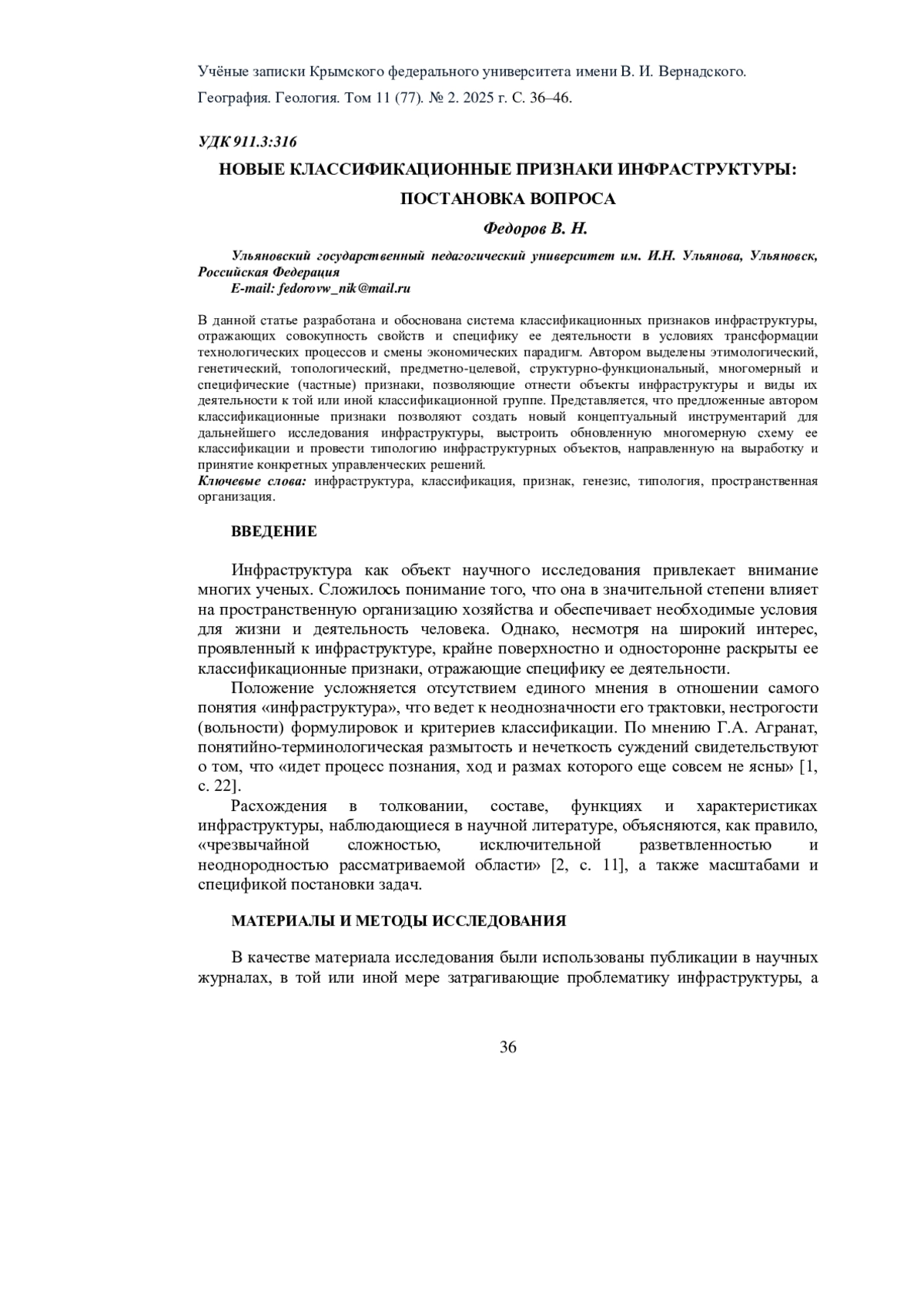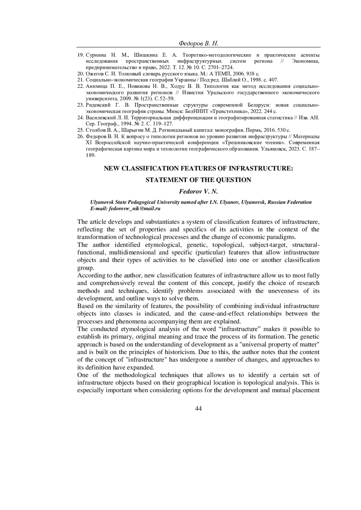 26. Федоров В. Н. К вопросу о типологии регионов по уровню развития инфраструктуры // Материалы XI Всероссийской научно-практической конференции “Трешниковские чтения”. Современная географическая картина мира и технологии географического образования. Ульяновск, 2023. С. 187-189. EDN: RHYZRD