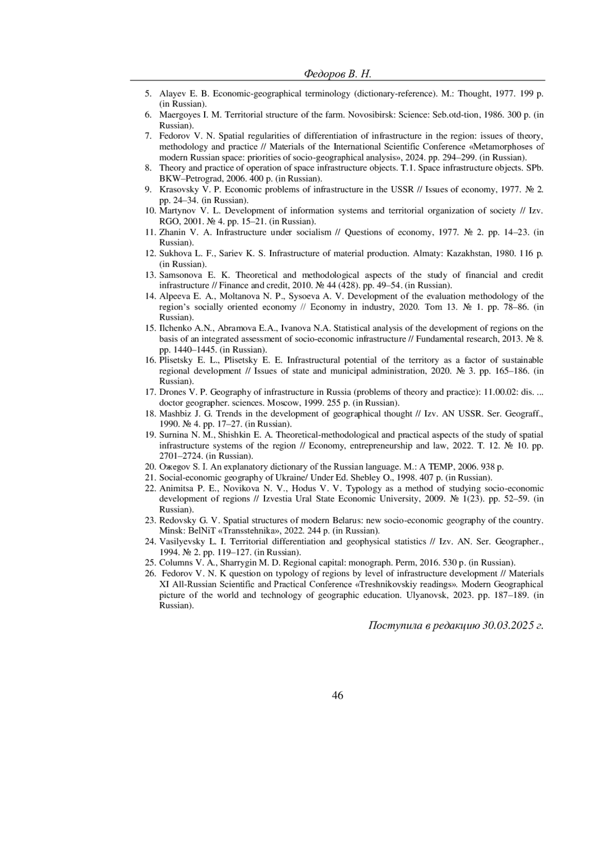 7. Федоров В. Н. Пространственные закономерности дифференциации инфраструктуры региона: вопросы теории, методологии и практики // Материалы Международной научной конференции “Метаморфозы современного российского пространства: приоритеты общественно-географического анализа”, 2024. С. 294-299. EDN: DYARMJ