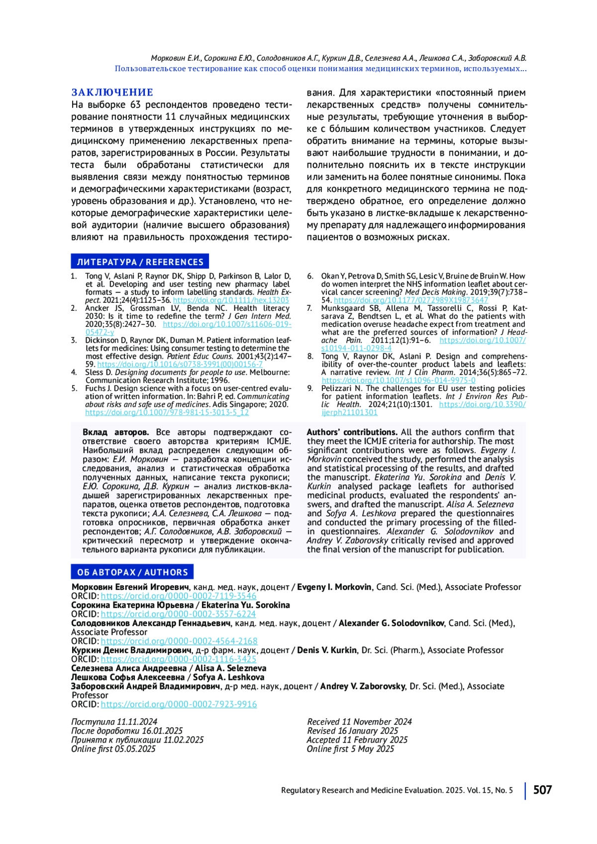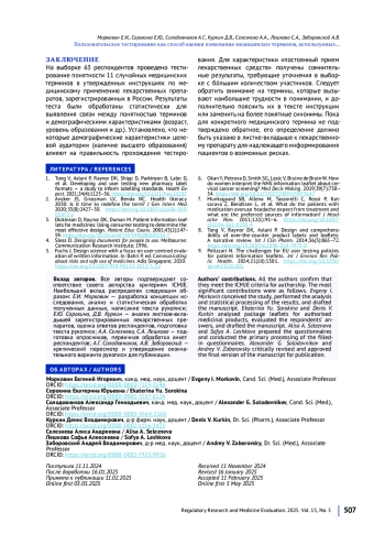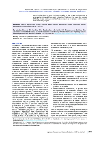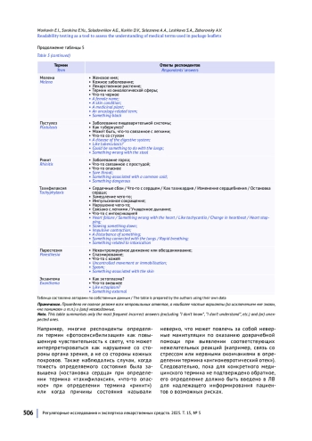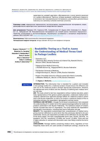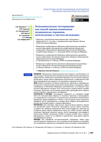 ВЫВОДЫ. При разработке листков-вкладышей, содержащих любые медицинские термины, независимо от того, насколько частым является их употребление за пределами медицинских учреждений, важно учитывать неоднородность характеристик целевой аудитории, обусловленную в числе прочего различиями в уровне образования. Термины, которые вызывают наибольшие трудности в понимании при пользовательском тестировании, должны быть дополнительно пояснены или заменены на более понятные синонимы.