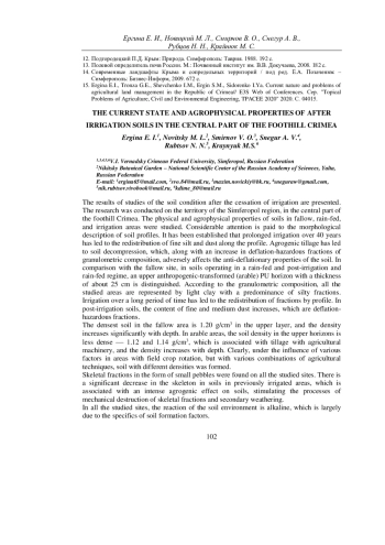 Приведены результаты исследований состояния почв после прекращения орошения. Исследования проводились на территории Симферопольского района, в центральной части предгорного Крыма. Исследовались физические и агрофизические свойства почв на залежном, богарном (суходольном) и постирригационном участках. Значительное внимание уделено морфологическому описанию профилей почв. Установлено, что длительное, на протяжении 40 лет орошение привело к перераспределению по профилю ила и пыли мелкой. Агрогенная обработка почвы привела к разуплотнению почвы, что на ряду, с увеличением дефляционно-опасных фракций гранулометрического состава неблагоприятно сказывается на противодефляционных свойствах почвы. При анализе гумусового состояния почв исследованных участков выяснилось, что черноземы на постирригационном участке содержат меньше всего гумуса.