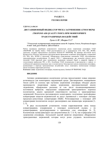 Работа посвящена апробации комплексного индикатора риска загрязнения атмосферы TAQI (TROPOMI Air Quality Index). TAQI рассчитывается по 5 компонентам (CO, NO2, SO2, HCHO, аэрозоли), которые определяются спутником Sentinel-5P TROPOMI. На примере восточной части Белорусского Полесья определены пространственно-временные колебания тропосферных содержаний CO, NO2, SO2, HCHO и аэрозолей. Обнаружены существенные изменения TAQI, обусловленные трансграничными воздействиями. В апреле 2024 г. зафиксированы две аномалии резкого роста значений TAQI (высокий риск загрязнения), вызванные пыльной бурей в северной Африке и техногенными выбросами NO2 и SO2. Колебания TAQI неоднородны в пространстве и зависят от особенностей движения воздушных масс и поллютантов. Зоны высокого риска загрязнения атмосферы, возникающие в периоды трансграничных воздействий, могут охватывать значительные площади (более половины территории региона).