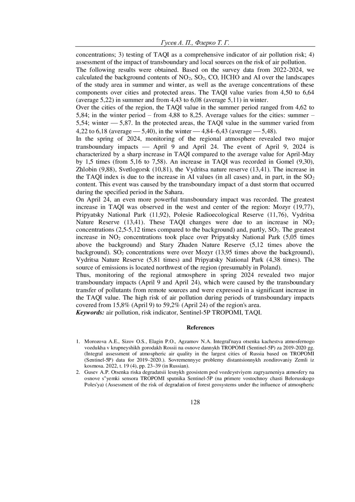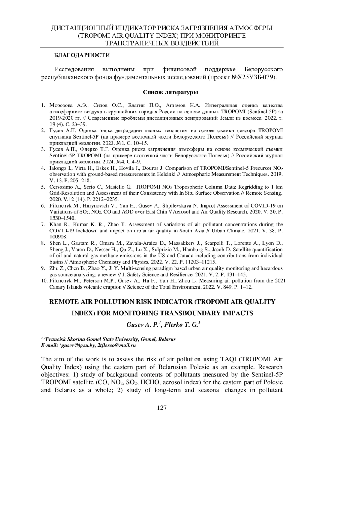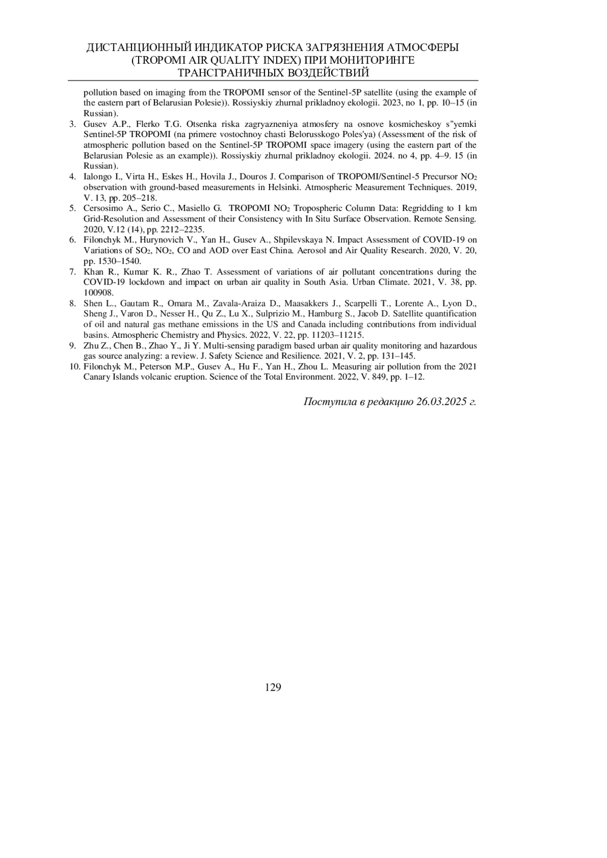 3. Гусев А.П., Флерко Т.Г. Оценка риска загрязнения атмосферы на основе космической съемки Sentinel-5P TROPOMI (на примере восточной части Белорусского Полесья) // Российский журнал прикладной экологии. 2024. №4. С.4-9. EDN: WUPHVQ