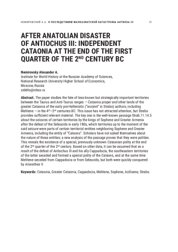 Статья: К ПОСЛЕДСТВИЯМ МАЛОАЗИАТСКОЙ КАТАСТРОФЫ АНТИОХА III: НЕЗАВИСИМАЯ КАТАОНИЯ КОНЦА ПЕРВОЙ ЧЕТВЕРТИ II В. ДО Н. Э (2024)