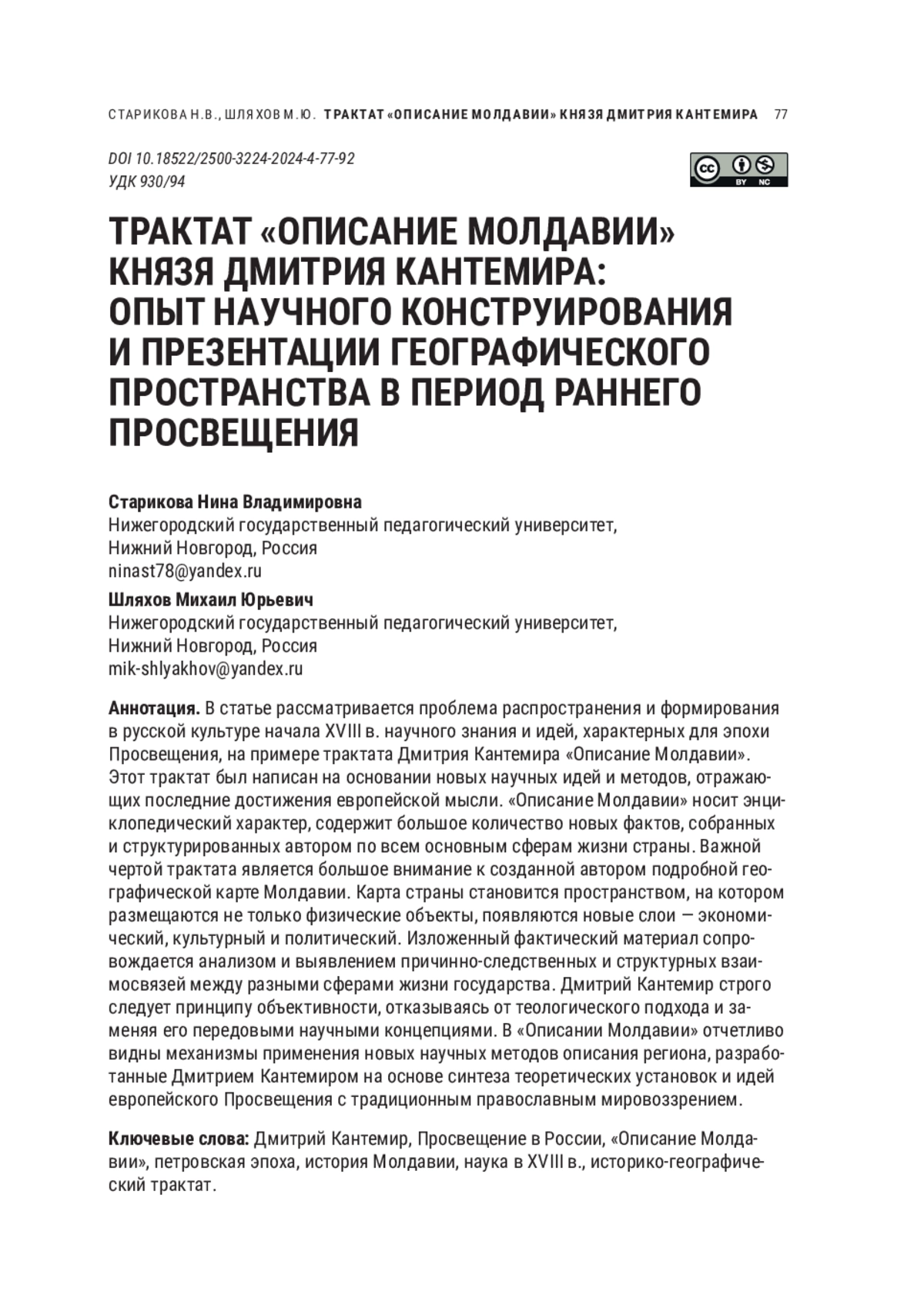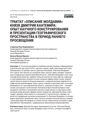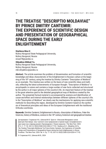 СТАРИКОВА Н. В., ШЛЯХОВ М. Ю. ТРАКТАТ «ОПИСАНИЕ МОЛДАВИИ» КНЯЗЯ ДМИТРИЯ КАНТЕМИРА: ОПЫТ НАУЧНОГО КОНСТРУИРОВАНИЯ И ПРЕЗЕНТАЦИИ ГЕОГРАФИЧЕСКОГО ПРОСТРАНСТВА В ПЕРИОД РАННЕГО ПРОСВЕЩЕНИЯ // НОВОЕ ПРОШЛОЕ. 2024. № 4