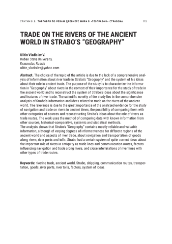 Выбор темы статьи обусловлен отсутствием комплексного анализа сведений о торговле по рекам в «Географии» Страбона и системы его представлений об их роли в древней торговле. Цель исследования — охарактеризовать сведения «Географии» о реках в контексте их значения для изучения торговли в древнем мире и реконструировать систему представлений Страбона о значении и особенностях речной торговли. Научная новизна исследования заключается в комплексном анализе сведений и представлений Страбона, относящихся к торговле по рекам древнего мира. Актуальность обусловлена большим значением анализируемых свидетельств для изучения судоходства и торговли по рекам в древности, возможностью их сопоставления с другими категориями источников и реконструкции представлений Страбона о роли рек как торговых магистралей. В работе использованы метод сопоставления данных с известной информацией из других источников, историко-сравнительный, системный и статистический методы. Проведенный анализ показывает, что «География» Страбона содержит в основном достоверные и ценные, хотя и различные по степени информативности для разных регионов древнего мира и аспектов торговли по рекам, сведения о судоходстве и транспортировке товаров по рекам, речных портах и пошлинах. Страбон обладал определенной системой вполне верных представлений о важной роли, которую в древности играли реки как торговые магистралий и пути сообщения, о факторах, влиявших на судоходство и торговлю по рекам, тесных взаимосвязях речных магистралей с иными видами торговых путей