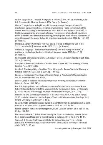 11. Улитин В.В. Торговля на речных путях древнего мира по данным письменных источников: основные особенности и проблемы изучения // Проблемы и исследования археологии, этнологии и всеобщей истории: сборник научных трудов. Краснодар: Кубанский гос. ун-т, 2024. С. 152-160. EDN: UESVOB