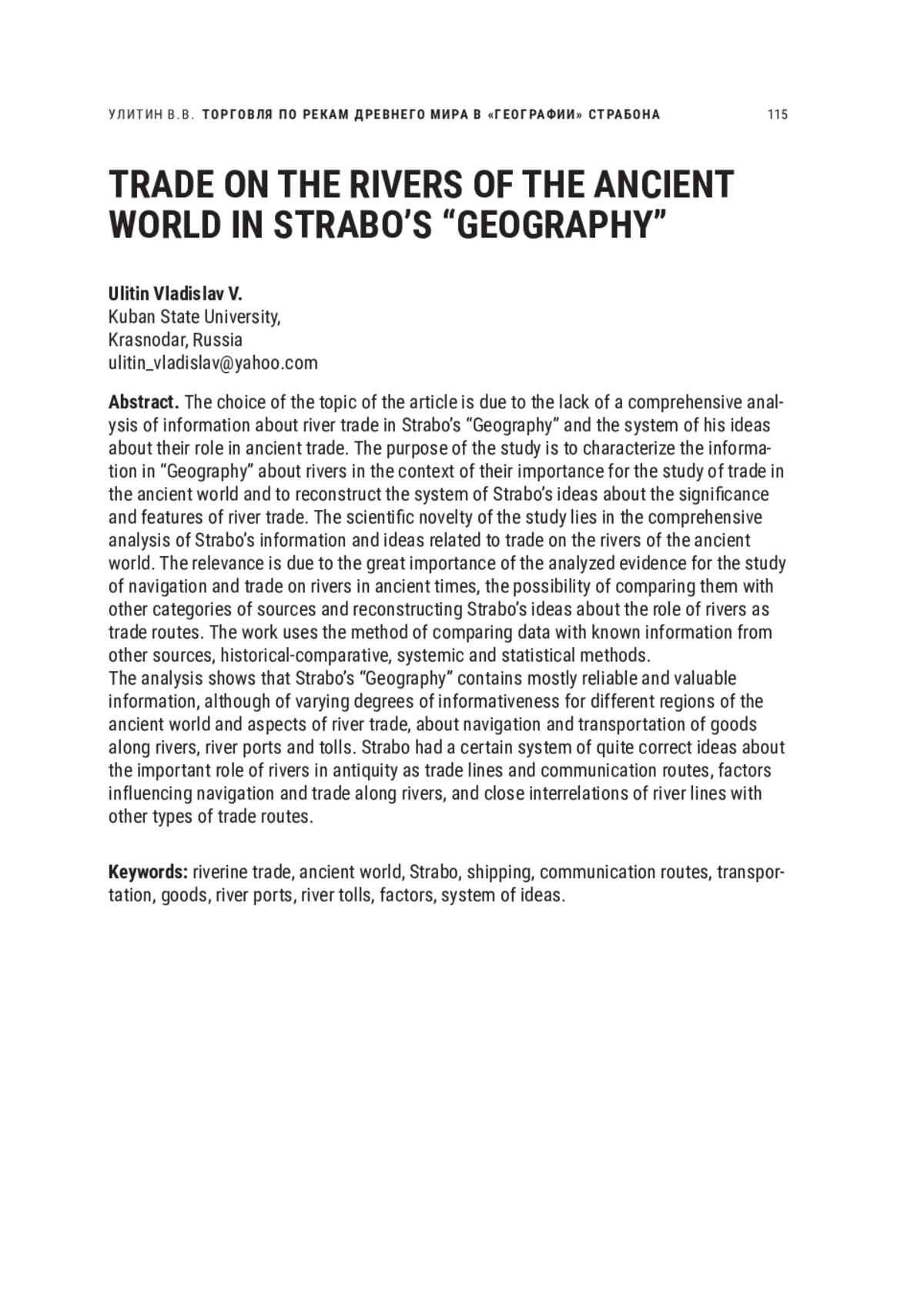 «География» Страбона неоднократно привлекалась в качестве важного источника для изучения различных аспектов торговли в древности, прежде всего античной. Его сведения о торговле по рекам также анализировались исследователями при характеристике экономических связей различных регионов древнего мира. При этом до сих пор, однако, отсутствует комплексный анализ как сведений о торговле по рекам в «Географии» Страбона, так и системы его представлений об их роли в древней торговле. Его проведение должно способствовать более полной характеристике торговли в древнем мире и особенностей творчества самого Страбона