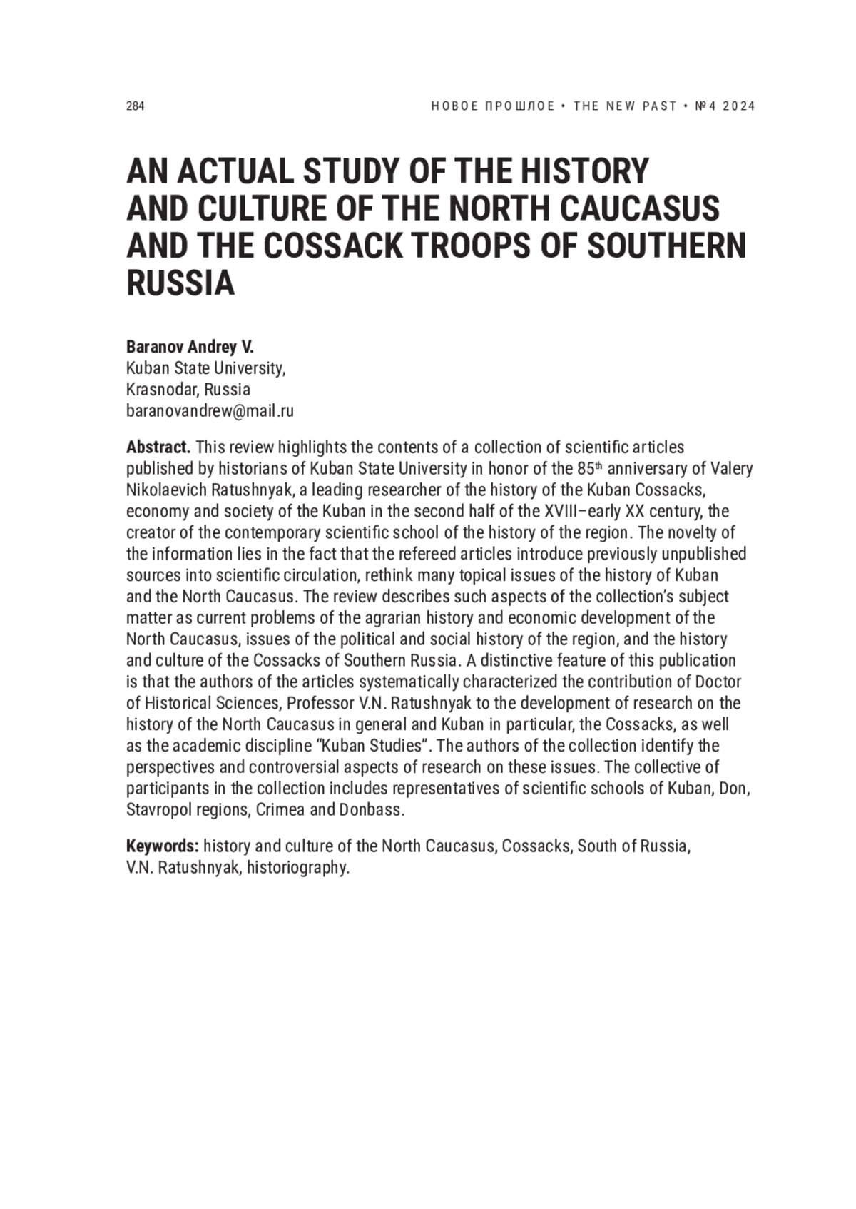 В данном обзоре освещается содержание сборника научных статей, изданного историками Кубанского государственного университета в честь 85-летия Валерия Николаевича Ратушняка — ведущего исследователя истории кубанского казачества, экономики и общества Кубани второй половины XVIII–начала ХХ в., создателя современной научной школы истории региона. Новизна информации состоит в том, что реферируемые статьи вводят в научный оборот ранее неопубликованные источники, переосмысливают многие актуальные вопросы истории Кубани и Северного Кавказа. В обзоре охарактеризованы такие аспекты тематики сборника, как актуальные проблемы аграрной истории и экономического развития Северного Кавказа, вопросы политической и социальной истории региона, истории и культуры казачеств Юга России. Отличительной чертой данного издания стало то, что авторы статей системно охарактеризовали вклад доктора исторических наук, профессора В. Н. Ратушняка в развитие исследований истории Северного Кавказа в целом и Кубани в частности, казачества, а также учебной дисциплины «Кубановедение». Авторы сборника определяют перспективы и дискуссионные аспекты исследований названной проблематики. Коллектив участников сборника включает в себя представителей научных школ Кубани, Дона, Ставрополья, Крыма и Донбасса