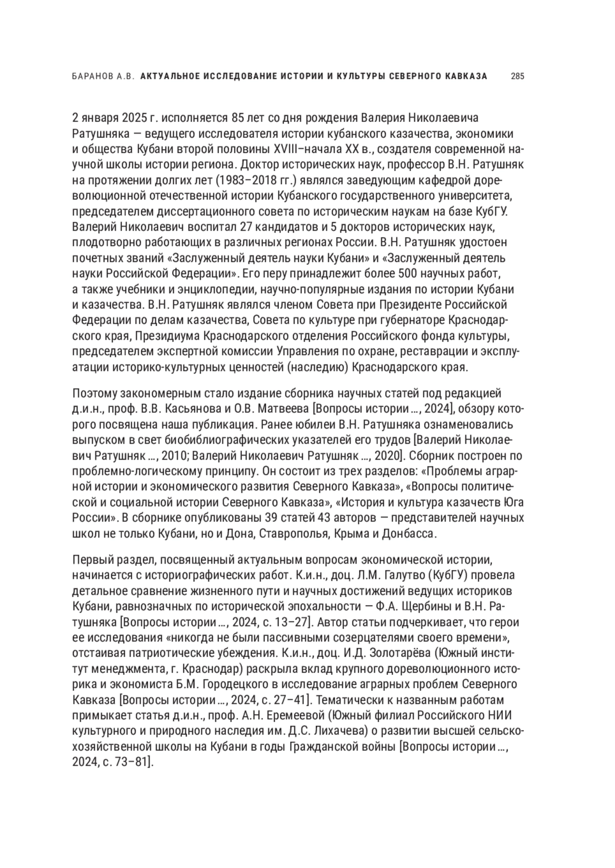2 января 2025 г. исполняется 85 лет со дня рождения Валерия Николаевича Ратушняка — ведущего исследователя истории кубанского казачества, экономики и общества Кубани второй половины XVIII–начала ХХ в., создателя современной научной школы истории региона. Доктор исторических наук, профессор В. Н. Ратушняк на протяжении долгих лет (1983–2018 гг.) являлся заведующим кафедрой дореволюционной отечественной истории Кубанского государственного университета, председателем диссертационного совета по историческим наукам на базе КубГУ. Валерий Николаевич воспитал 27 кандидатов и 5 докторов исторических наук, плодотворно работающих в различных регионах России.
