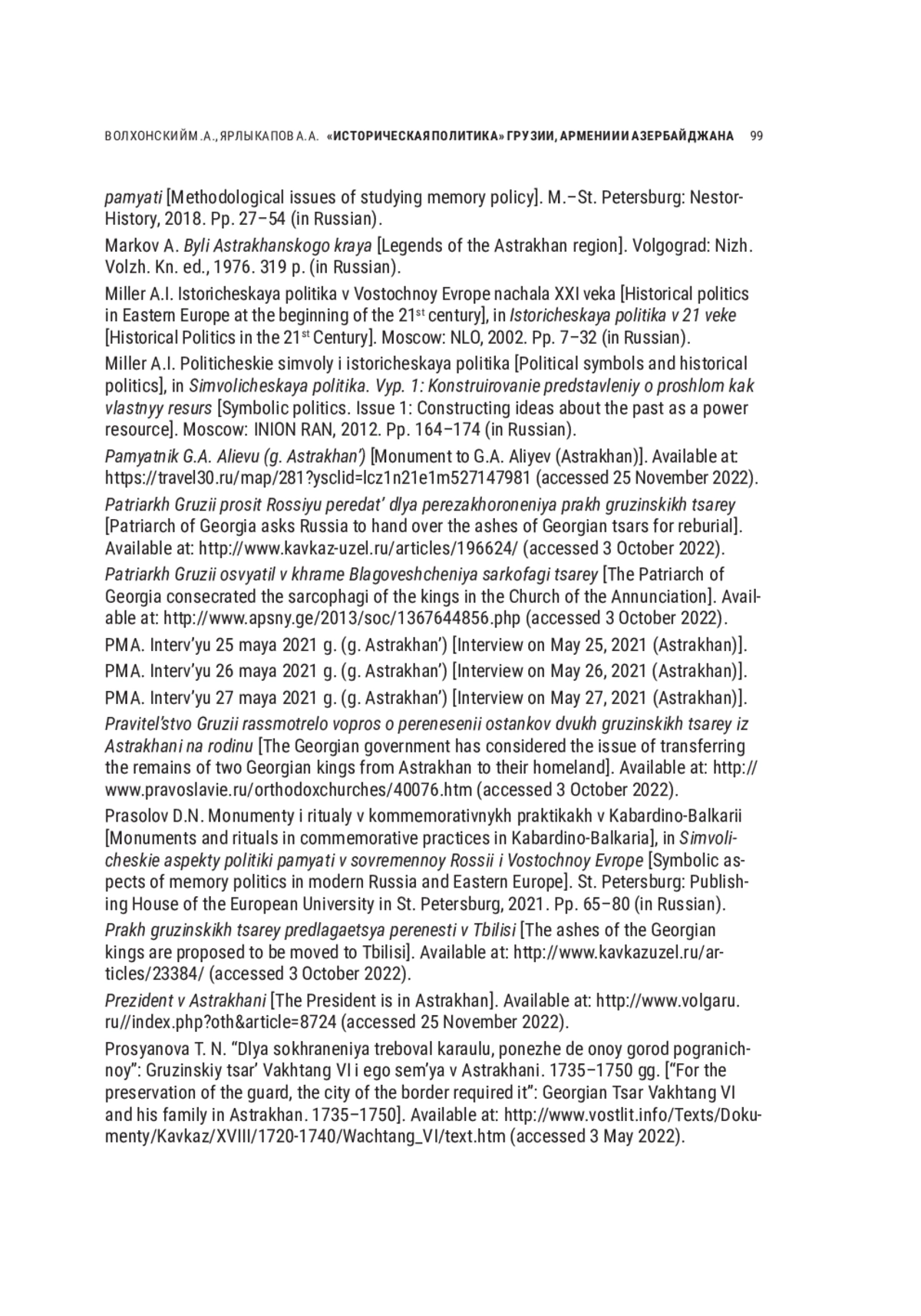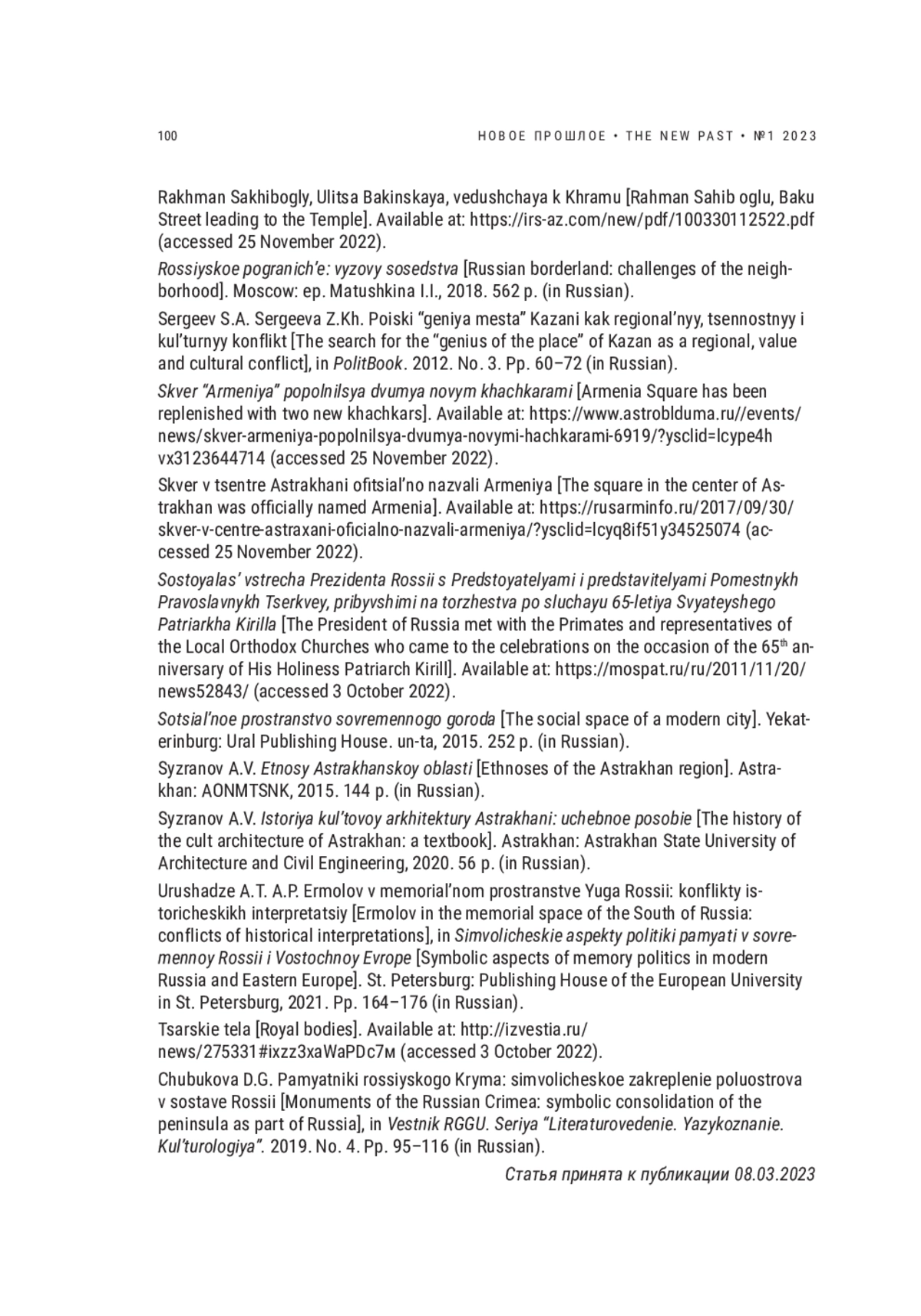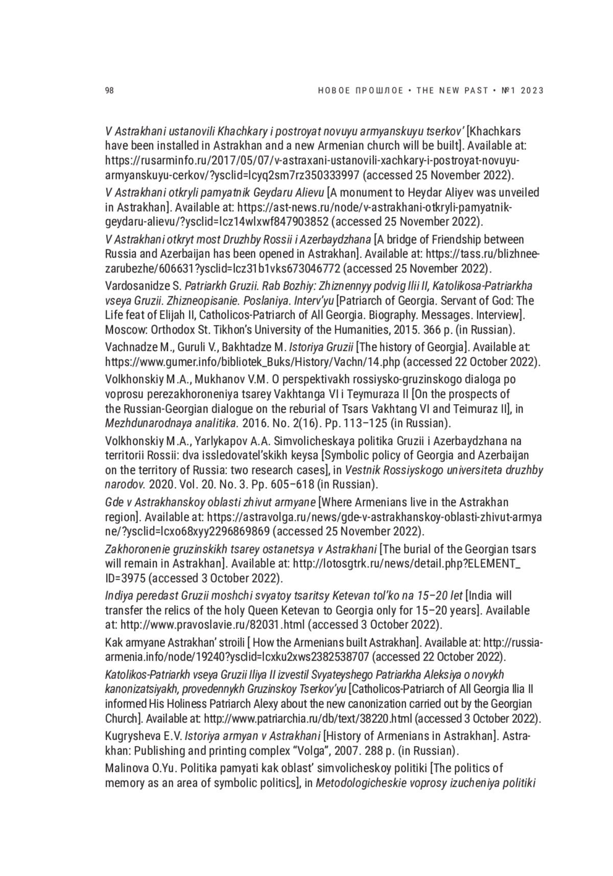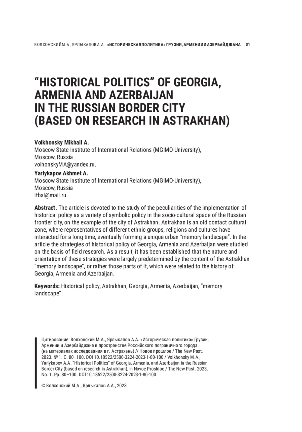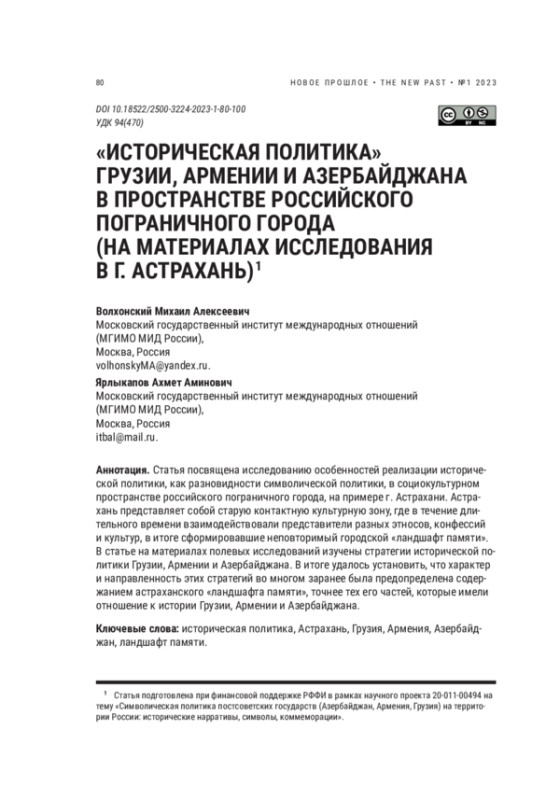ВОЛХОНСКИЙ М. А., ЯРЛЫКАПОВ А. А. "ИСТОРИЧЕСКАЯ ПОЛИТИКА" ГРУЗИИ, АРМЕНИИ И АЗЕРБАЙДЖАНА В ПРОСТРАНСТВЕ РОССИЙСКОГО ПОГРАНИЧНОГО ГОРОДА (НА МАТЕРИАЛАХ ИССЛЕДОВАНИЯ В Г. АСТРАХАНЬ) // НОВОЕ ПРОШЛОЕ. 2023. № 1