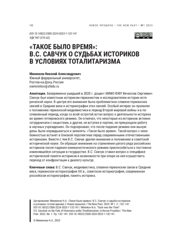 Безвременно ушедший в 2020 г. доцент ИИМО ЮФУ Вячеслав Сергеевич Савчук был известным историком-германистом и исследователем истории исторической науки. В центре его внимания была проблематика славяно-германских связей в Средние века и историографии этих связей. Особый интерес он проявлял к положению германской медиевистики в период Второй мировой войны и в послевоенный период, когда со всей остротой встал вопрос о деятельности историка во время гитлеровского режима. Он отмечал, что некоторые из историков активно сотрудничали с нацистами, а другие, не вступая в партию, не прекращали работу в научных учреждениях. Он подчеркивал, что после падения режима они вынуждены были оправдываться и заявлять: «Такое было время». Такой вопрос с неизбежностью встанет в близкой перспективе перед современными отечественными историками. Вместе с тем В. С. Савчук уделял внимание и положению в советской исторической науке. Он обращал внимание на стремление целого ряда российских историков после падения коммунистического режима приспособиться к постоянно изменявшейся ситуации в государстве. В. C. Савчук ставил вопрос о специфике исторической памяти историков и возможности при опоре на нее осуществить переход от конфронтации к диалогу культур