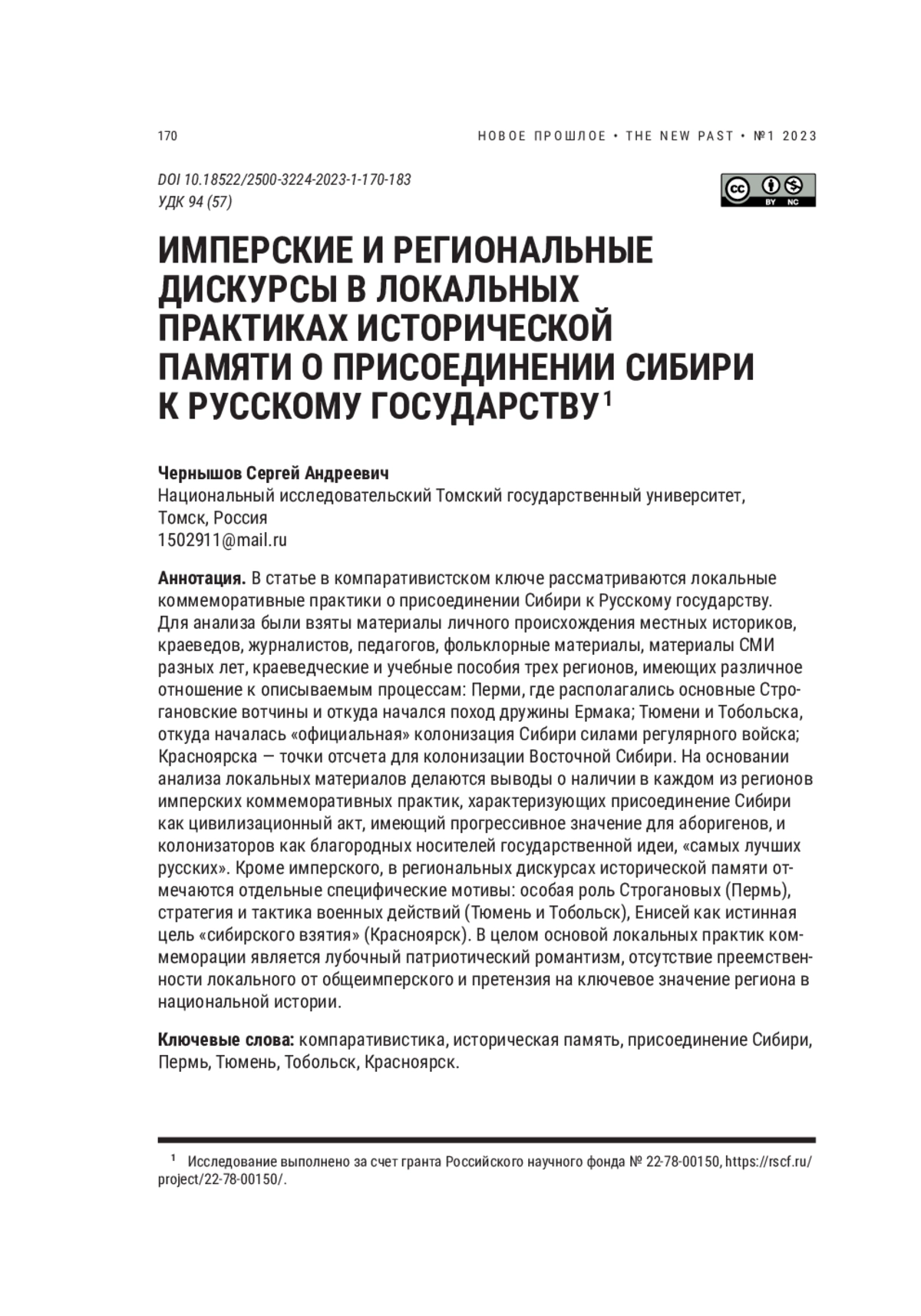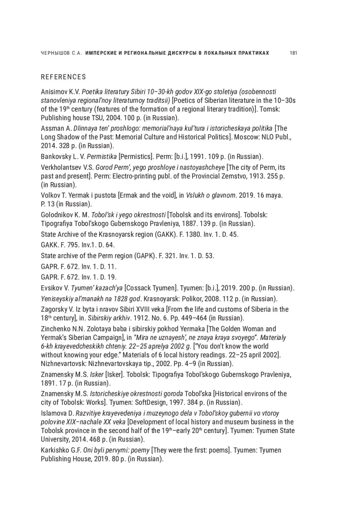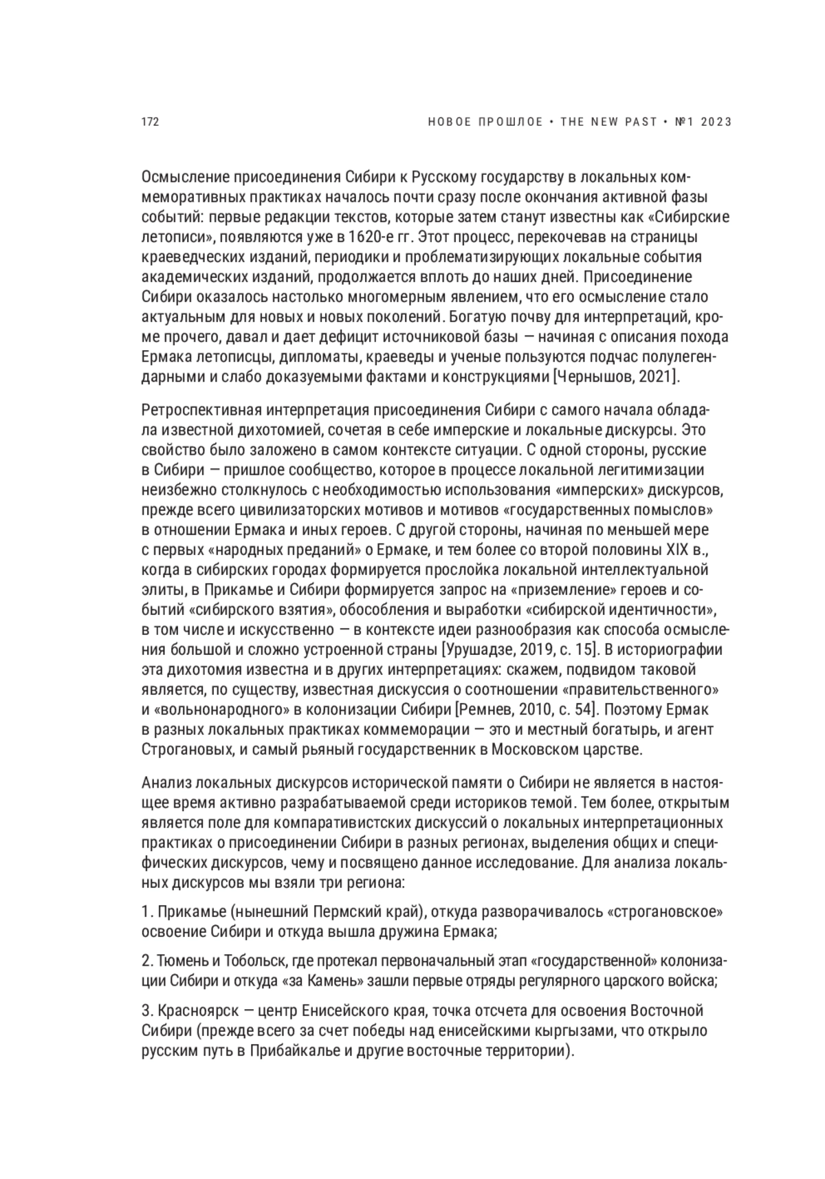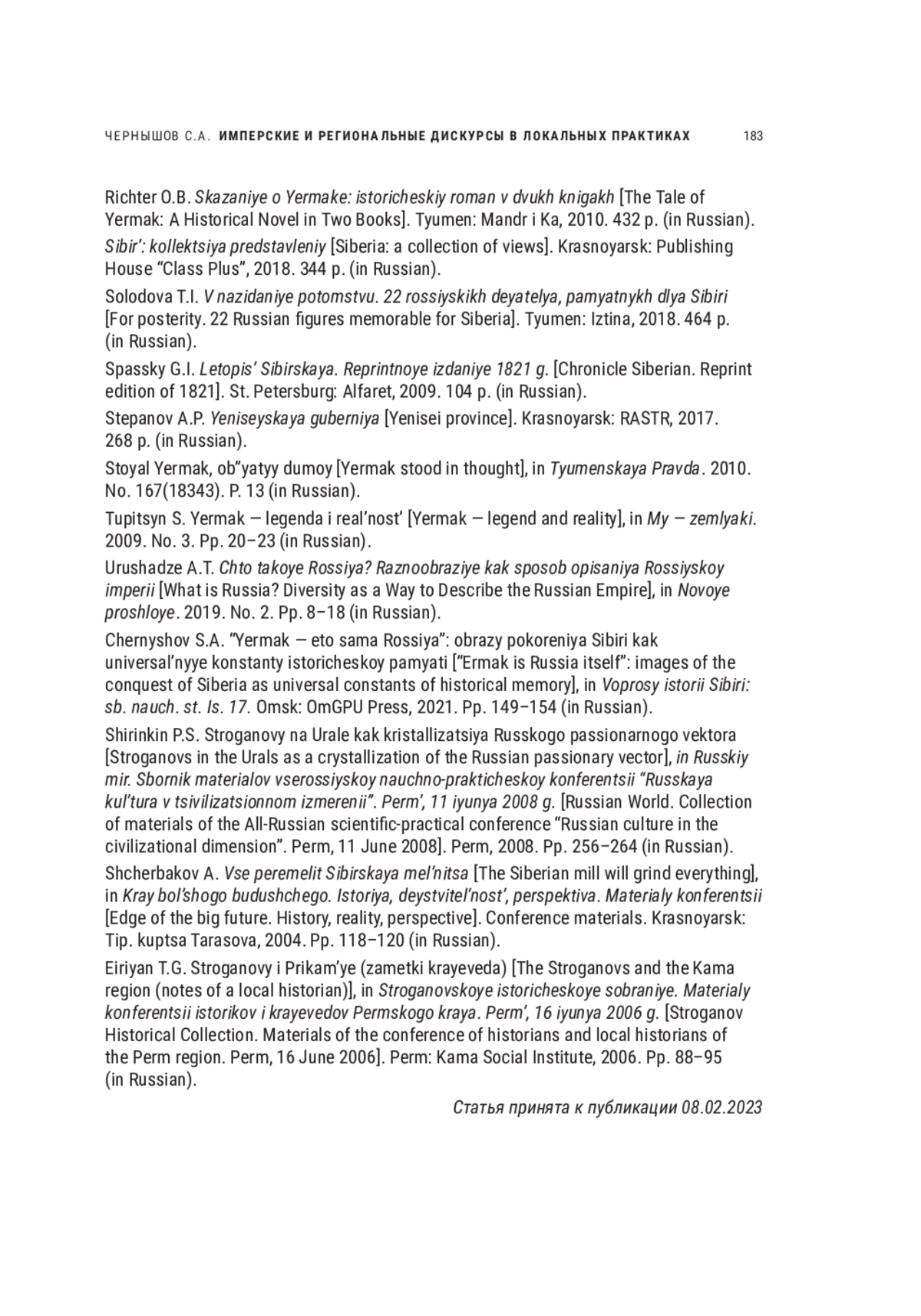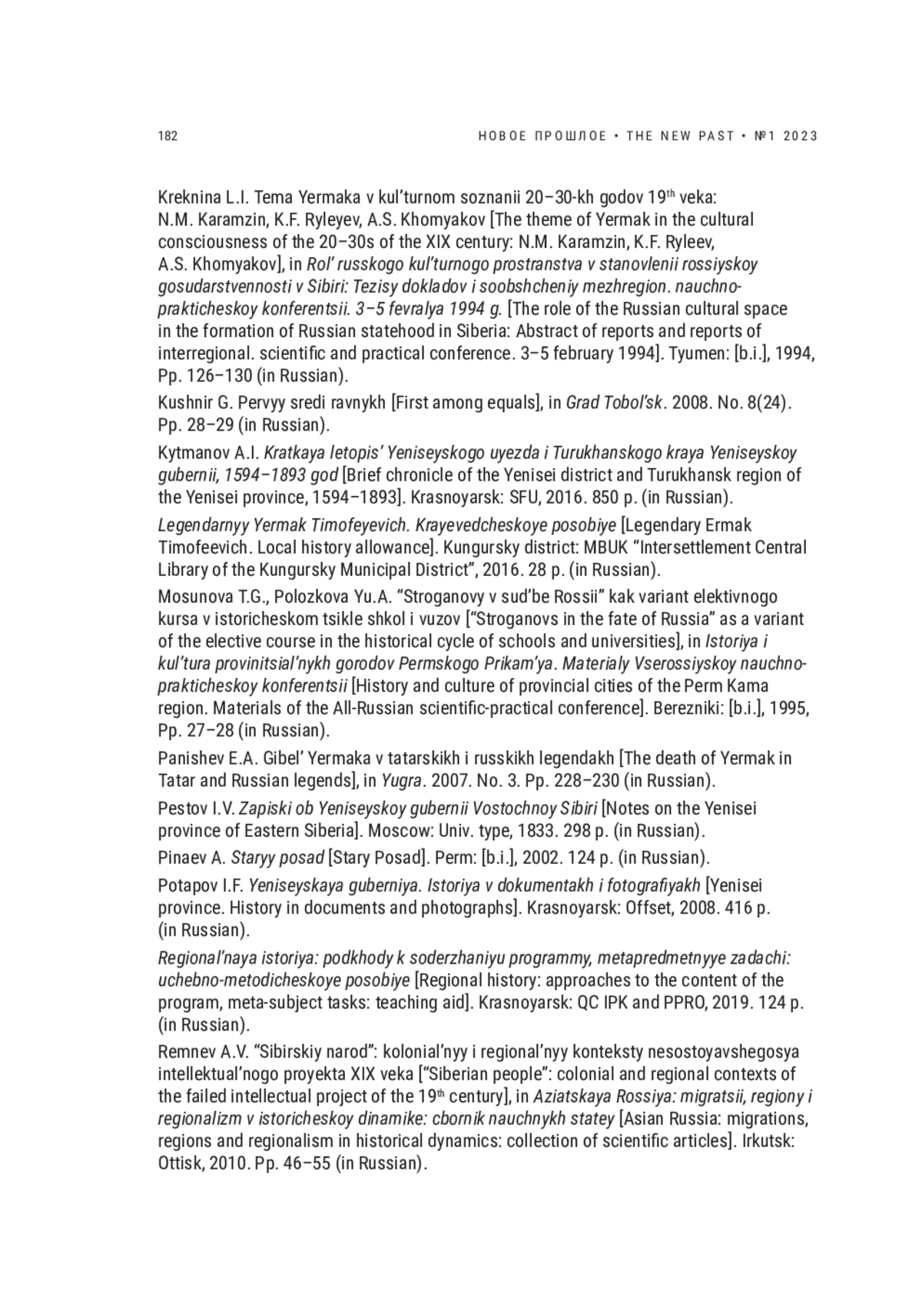 39. Чернышов С.А. “Ермак - это сама Россия”: образы покорения Сибири как универсальные константы исторической памяти // Вопросы истории Сибири: сб. науч. ст. Вып. 17. Омск: Изд-во ОмГПУ, 2021. С. 149-154. EDN: PDSARP