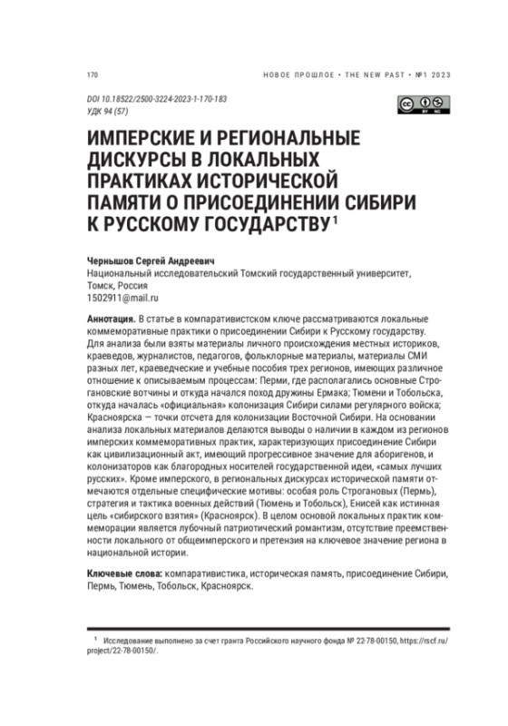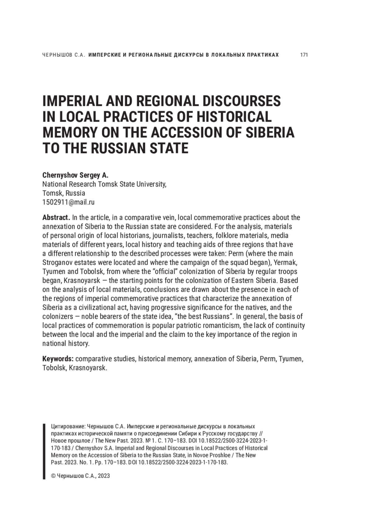 В статье в компаративистском ключе рассматриваются локальные коммеморативные практики о присоединении Сибири к Русскому государству. Для анализа были взяты материалы личного происхождения местных историков, краеведов, журналистов, педагогов, фольклорные материалы, материалы СМИ разных лет, краеведческие и учебные пособия трех регионов, имеющих различное отношение к описываемым процессам: Перми, где располагались основные Строгановские вотчины и откуда начался поход дружины Ермака; Тюмени и Тобольска, откуда началась «официальная» колонизация Сибири силами регулярного войска; Красноярска — точки отсчета для колонизации Восточной Сибири. На основании анализа локальных материалов делаются выводы о наличии в каждом из регионов имперских коммеморативных практик, характеризующих присоединение Сибири как цивилизационный акт, имеющий прогрессивное значение для аборигенов, и колонизаторов как благородных носителей государственной идеи, «самых лучших русских». Кроме имперского, в региональных дискурсах исторической памяти отмечаются отдельные специфические мотивы: особая роль Строгановых (Пермь), стратегия и тактика военных действий (Тюмень и Тобольск), Енисей как истинная цель «сибирского взятия» (Красноярск). В целом основой локальных практик коммеморации является лубочный патриотический романтизм, отсутствие преемственности локального от общеимперского и претензия на ключевое значение региона в национальной истории