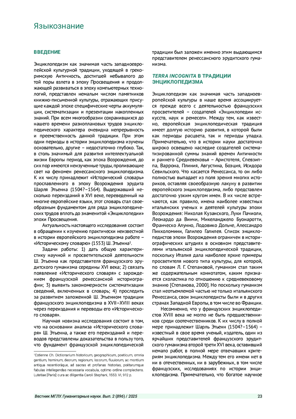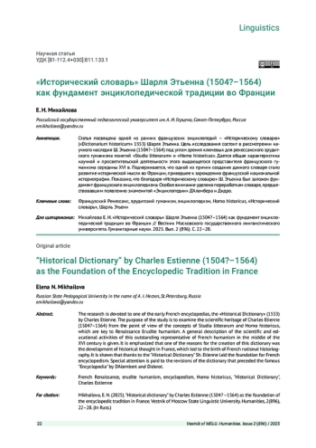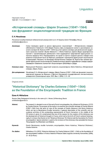 Статья посвящена одной из ранних французских энциклопедий - «Историческому словарю» («Dictionarium historicum» 1553) Шарля Этьенна. Цель исследования состоит в рассмотрении научного наследия Ш. Этьенна (1504?-1564) под углом зрения ключевых для ренессансного эрудитского гуманизма понятий «Studia litterarum» и «Homo historicus». Дается общая характеристика научной и просветительской деятельности этого выдающегося представителя французского гуманизма середины XVI в. Подчеркивается, что одной из причин создания данного словаря стало развитие исторической мысли во Франции, приведшее к зарождению французской национальной историографии. Показано, что благодаря «Историческому словарю» Ш. Этьенна был заложен фундамент французского энциклопедизма. Особое внимание уделено переработкам словаря, предшествовавшим появлению знаменитой «Энциклопедии» Д’Аламбера и Дидро.