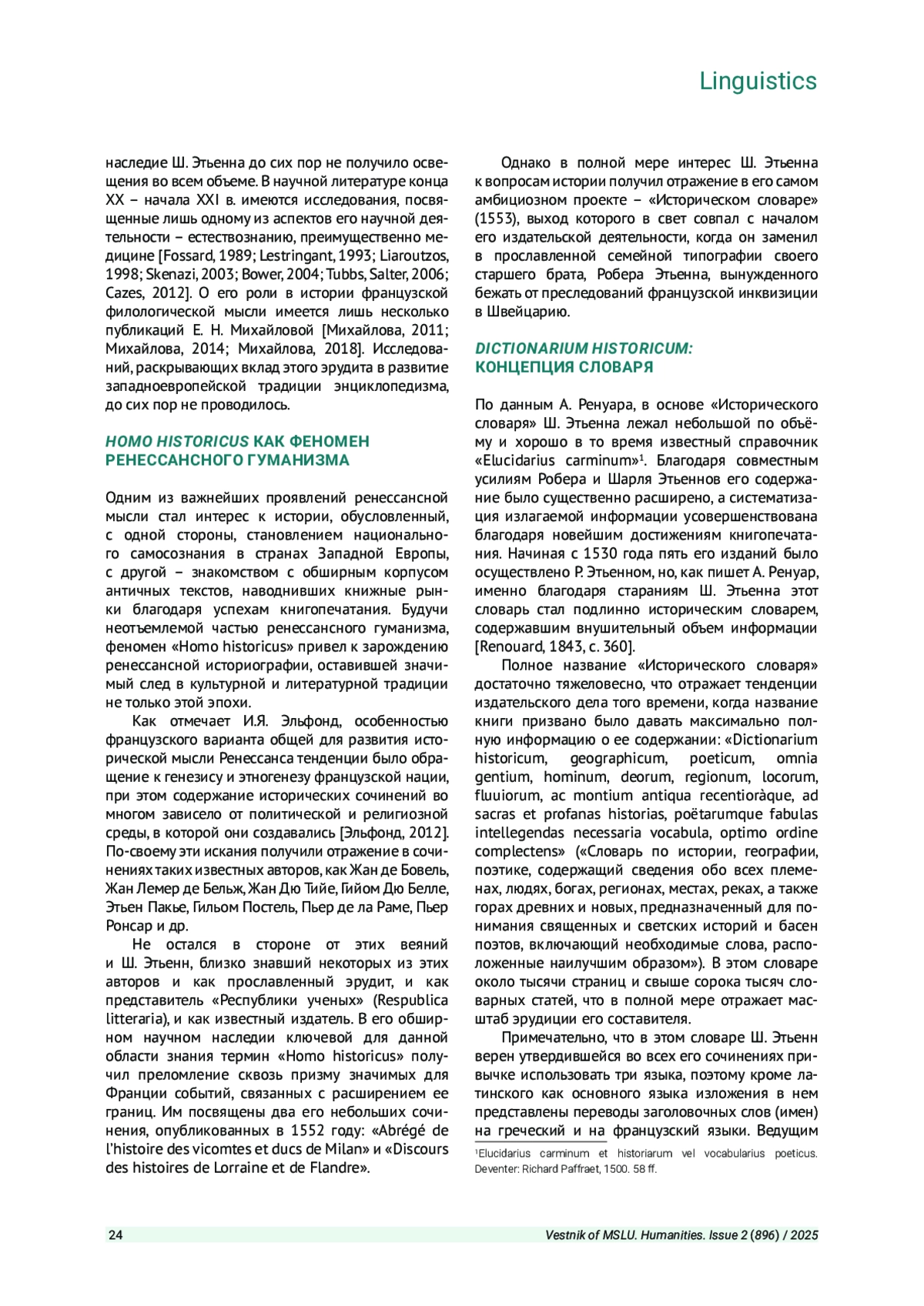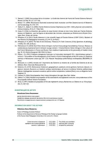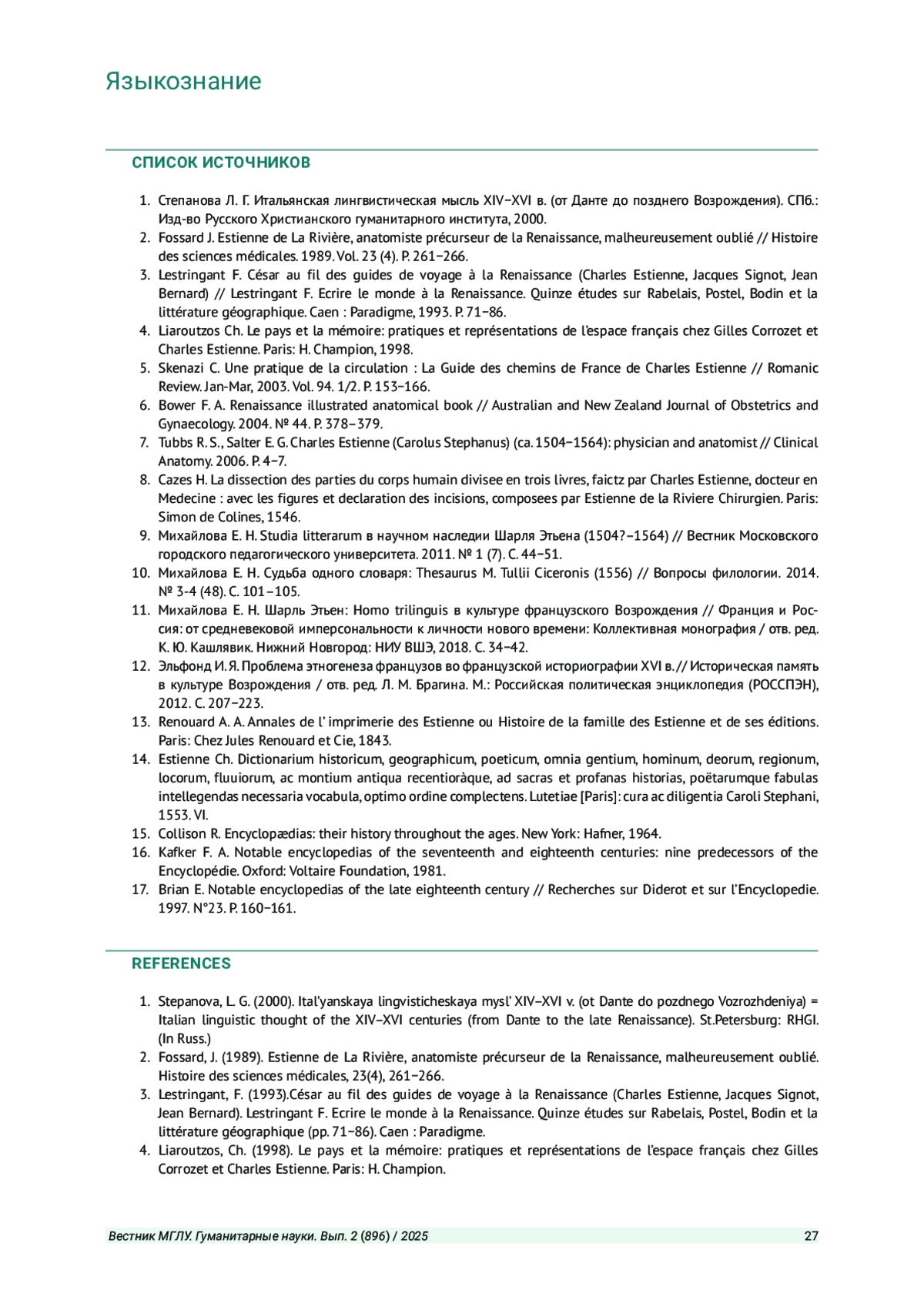 9. Михайлова Е. Н. Studia litterarum в научном наследии Шарля Этьена (1504?-1564) // Вестник Московского городского педагогического университета. 2011. № 1 (7). С. 44-51.